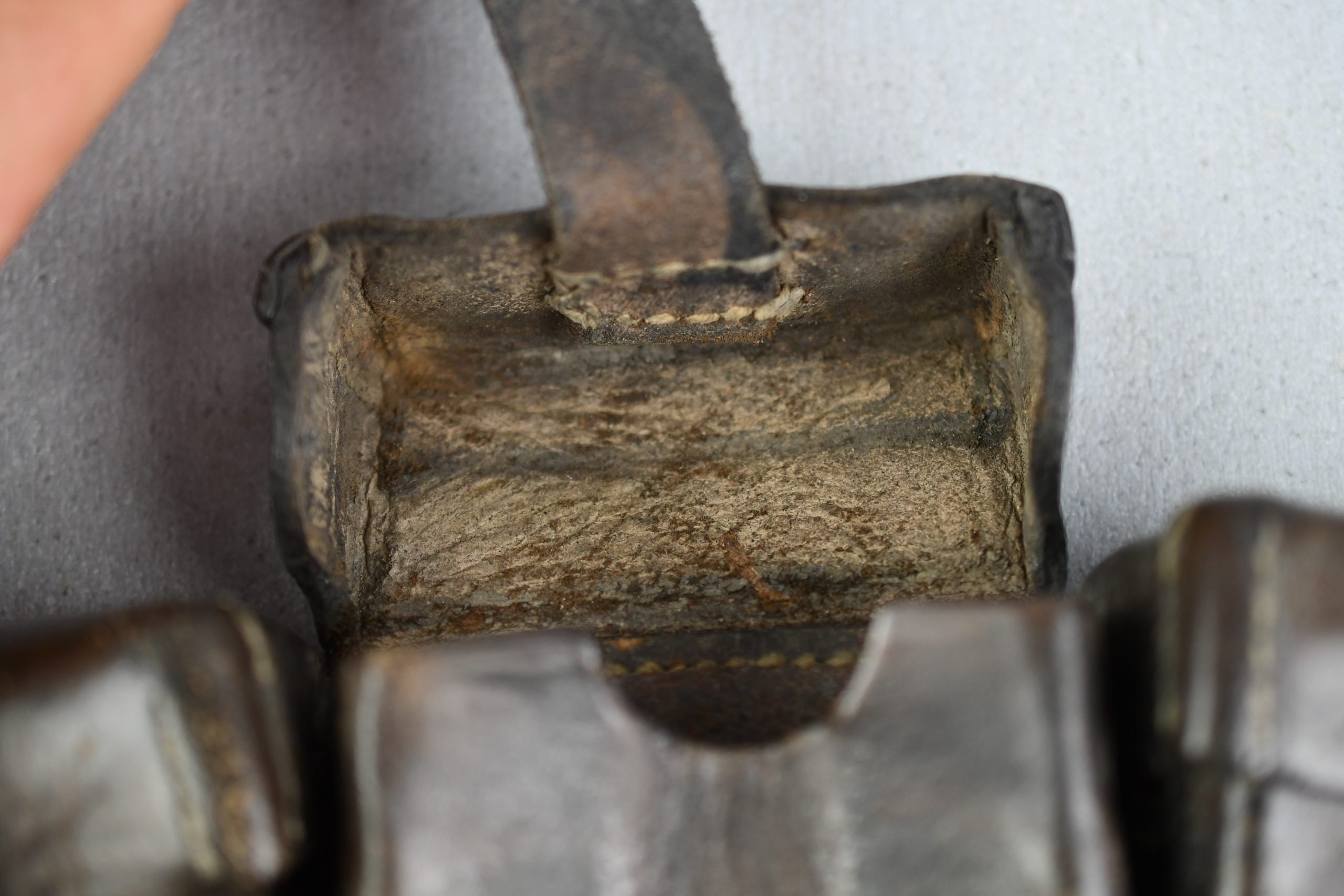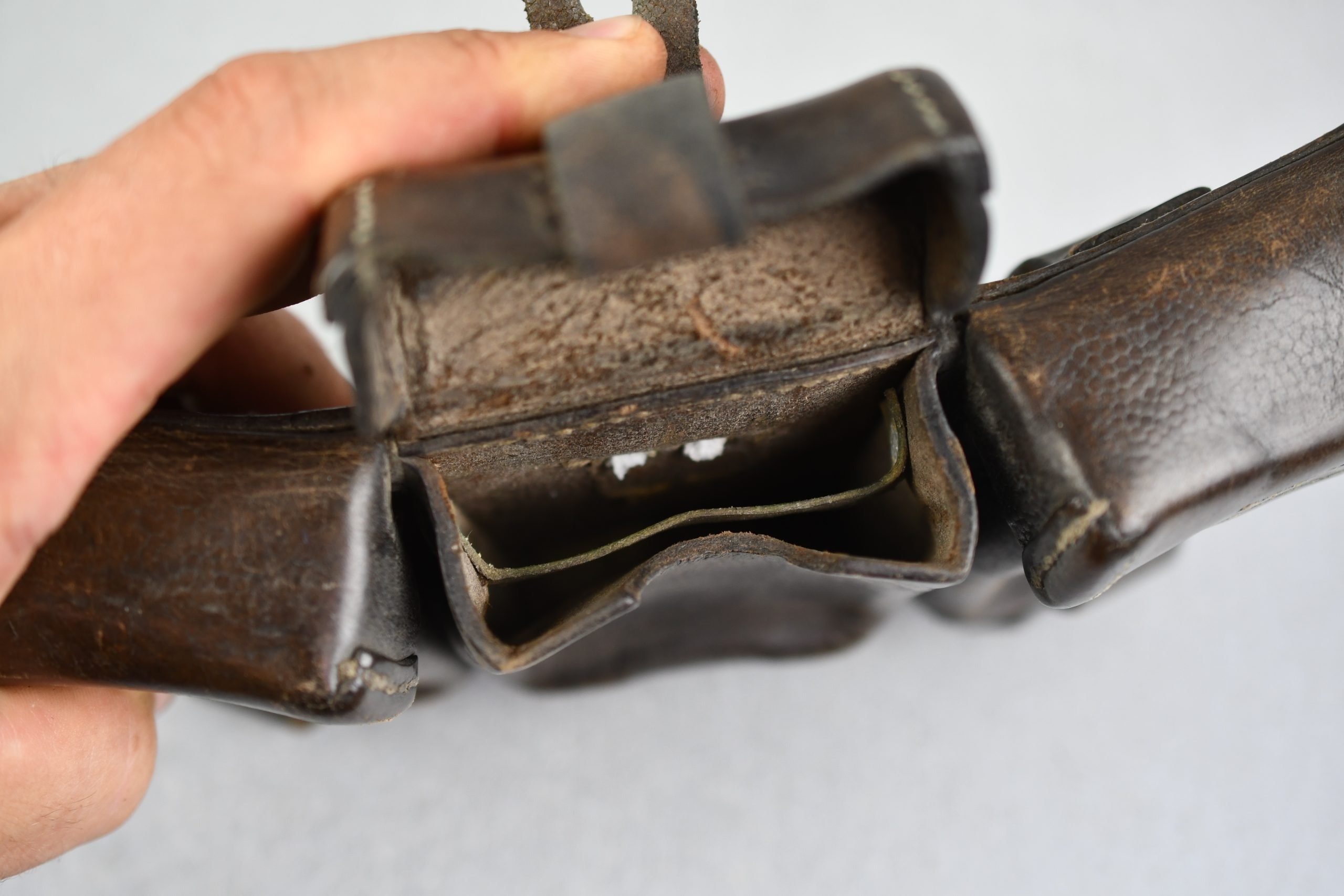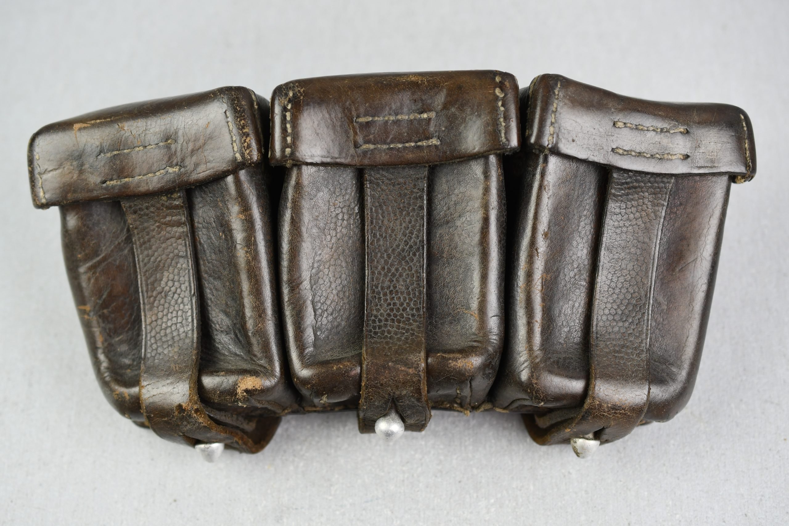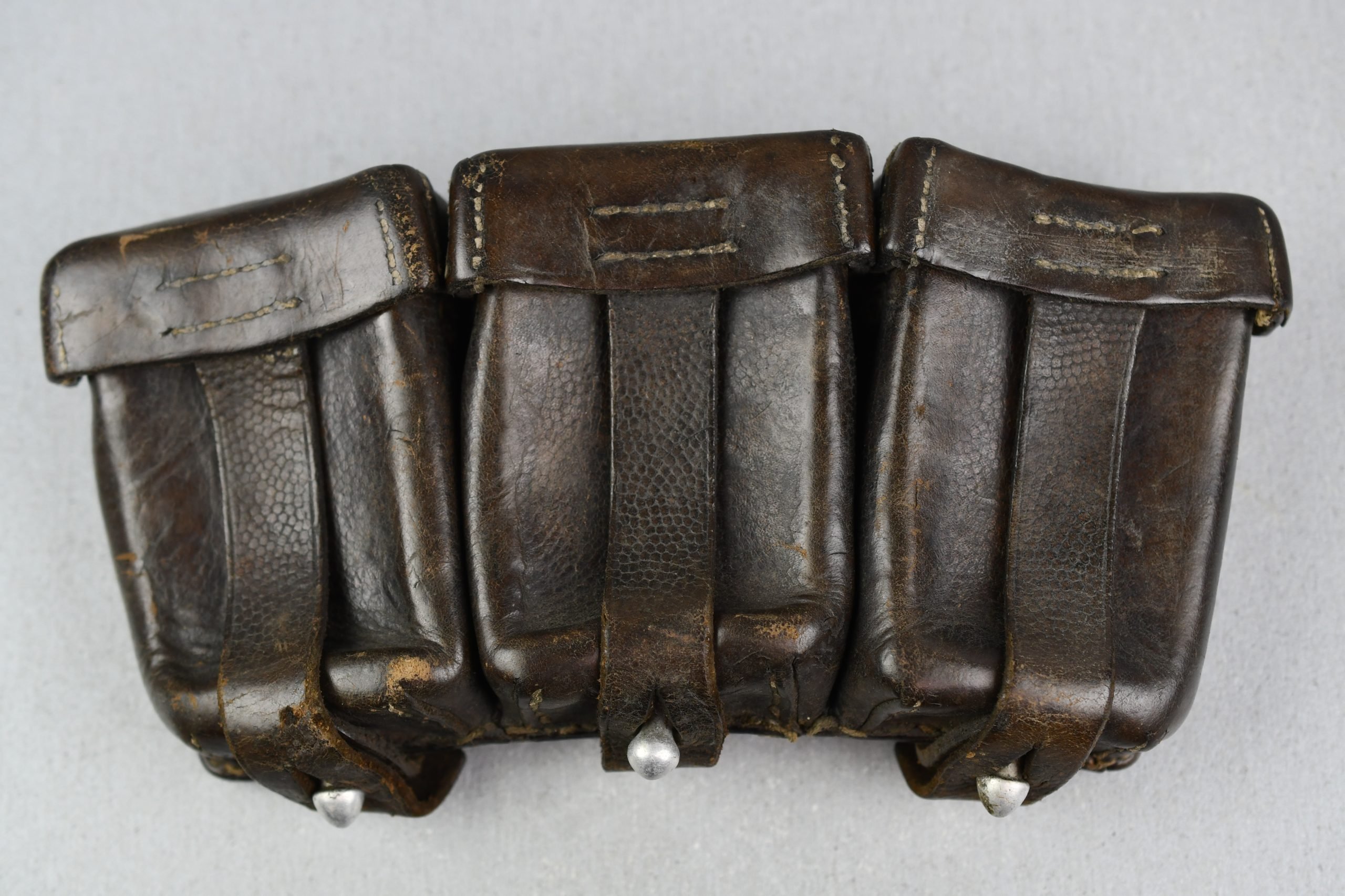 Honest and light worn Wehrmacht/SS K98 ammo pouch in good condition. Complete with spacers intact. Maker marked by A. Jeurgens, Goch 1939.