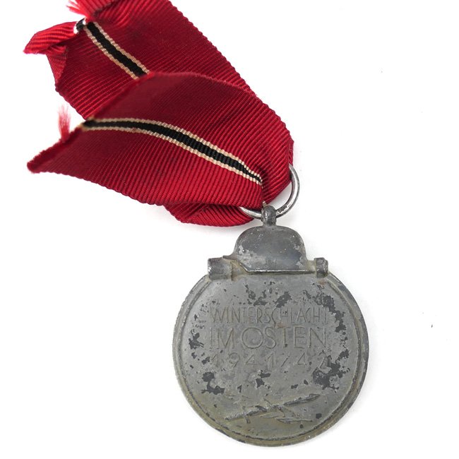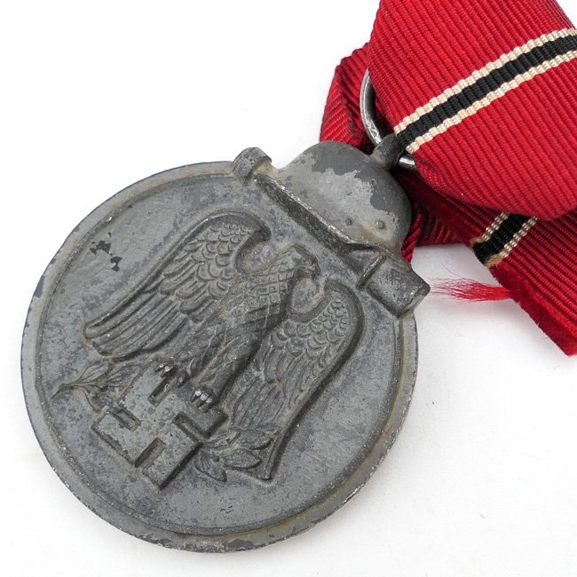 German Eastern Front Medal (Medaille fΓΌr die Winterschlacht im Osten). The German Eastern Front Medal (Medaille fΓΌr die Winterschlacht im Osten) was instituted on 26 May 1942 to commemorate the first winter campaign in Russia, operation Barbarossa. The medal was also known as the 'Frozen Meat Medal'. Approximately 3 million examples have been awarded. The medal is maker marked with number '55' indicating production by the company of 'J.E. Hammer & SΓΆhne' from Geringswalde. The medal is complete with its original short ribbon as found. Nice example in good used condition!