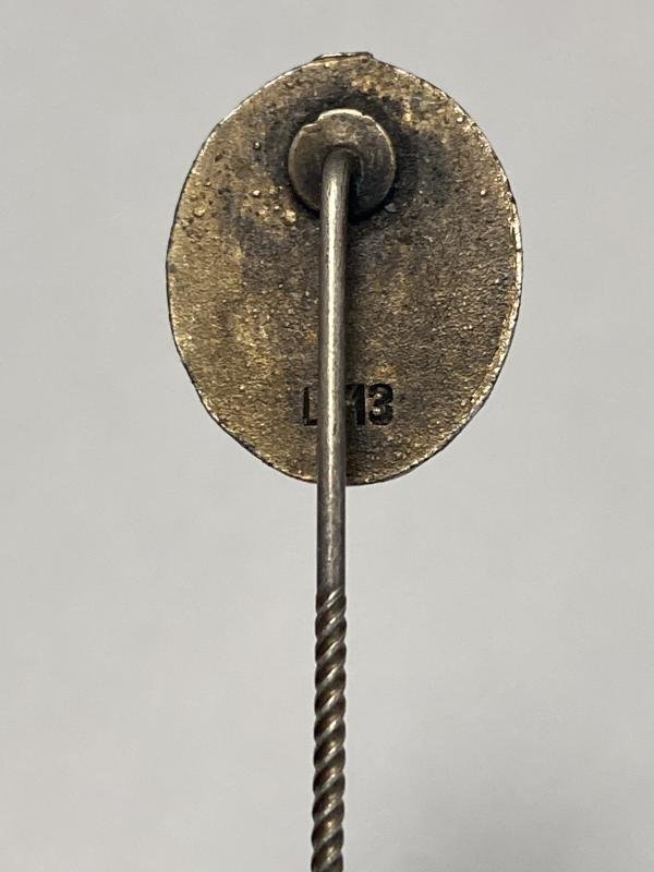 Original WW2 silver wound badge miniature stick pin marked L/13 on the reverse. Stick pin retains good finish however evident rubbing of the high parts.