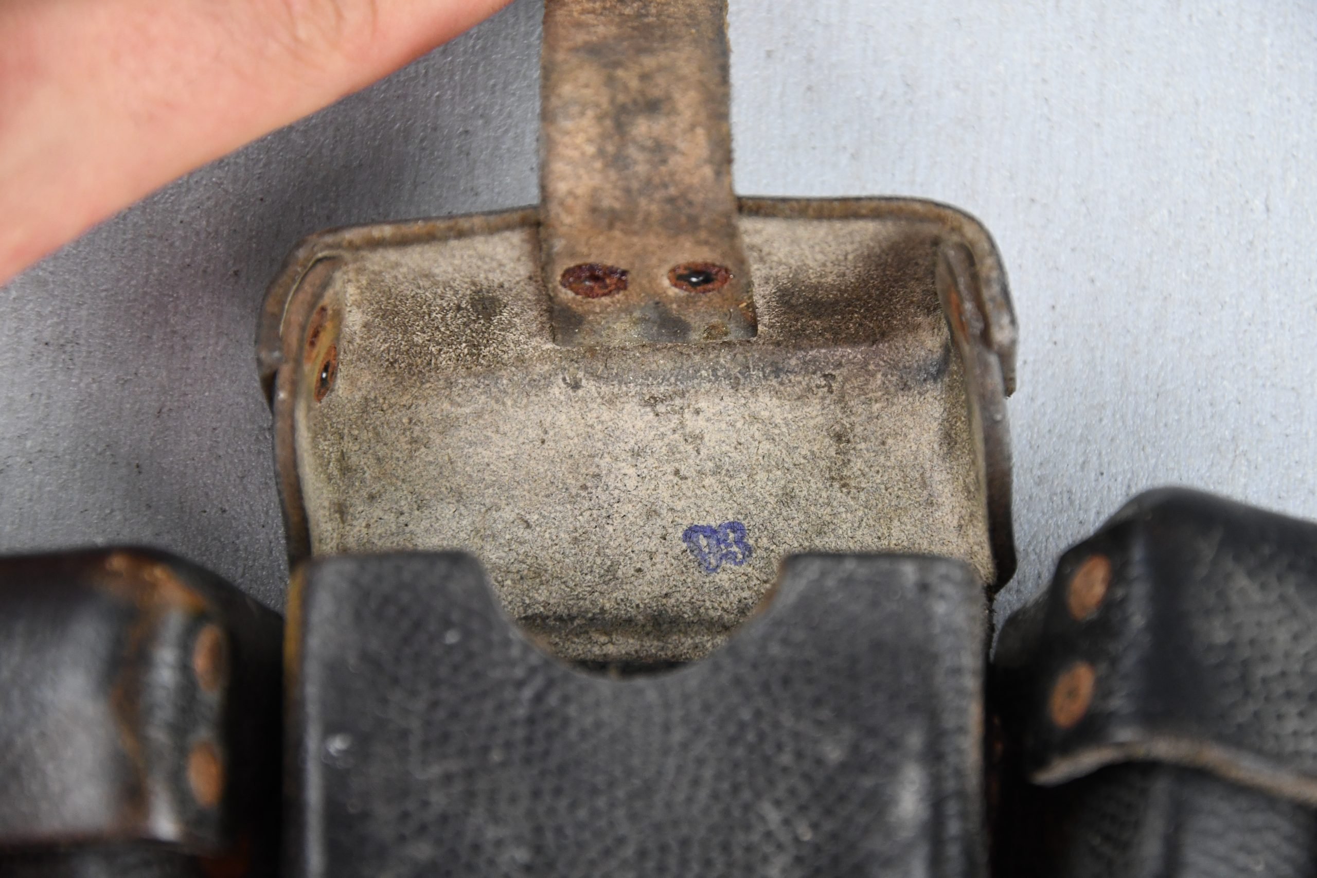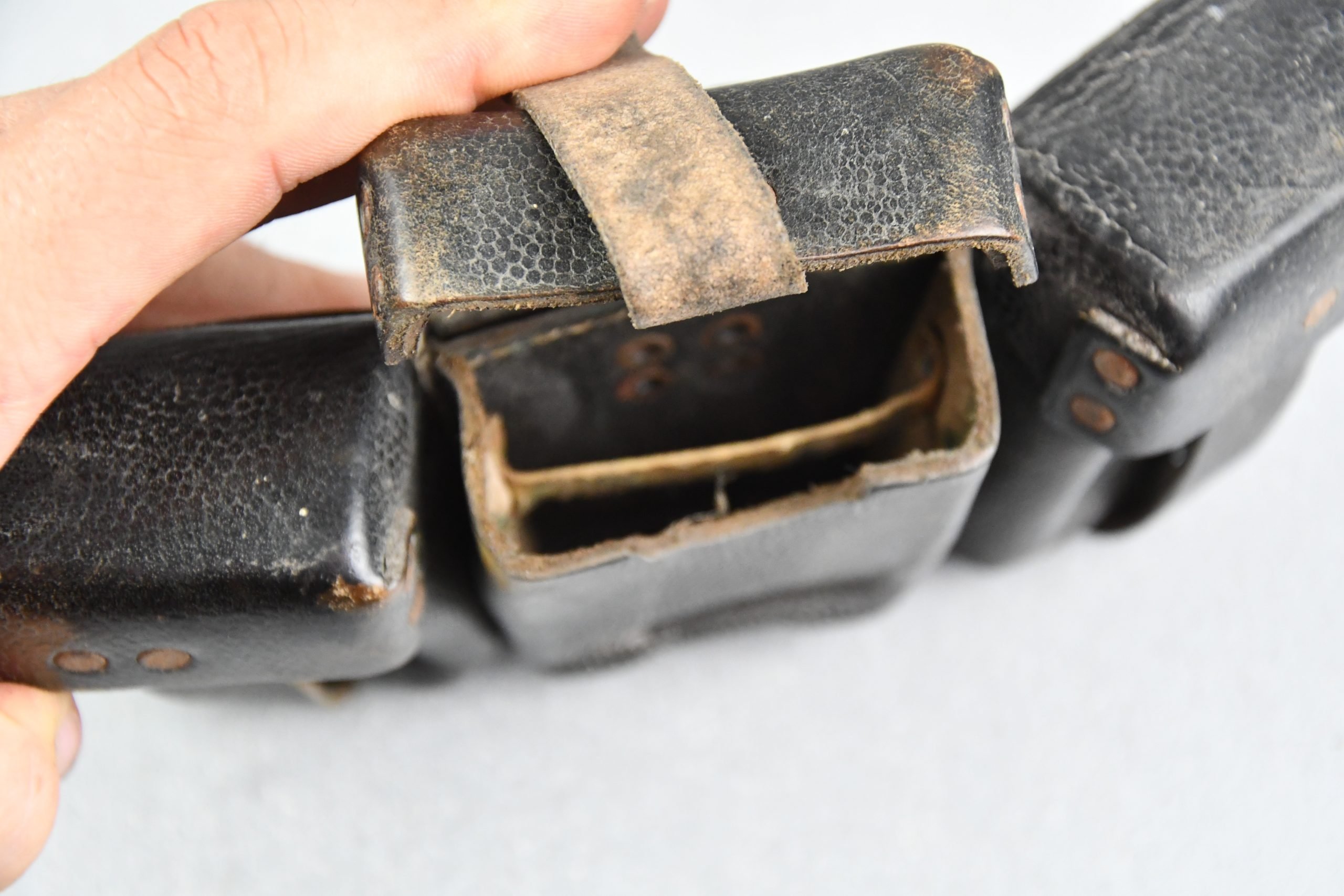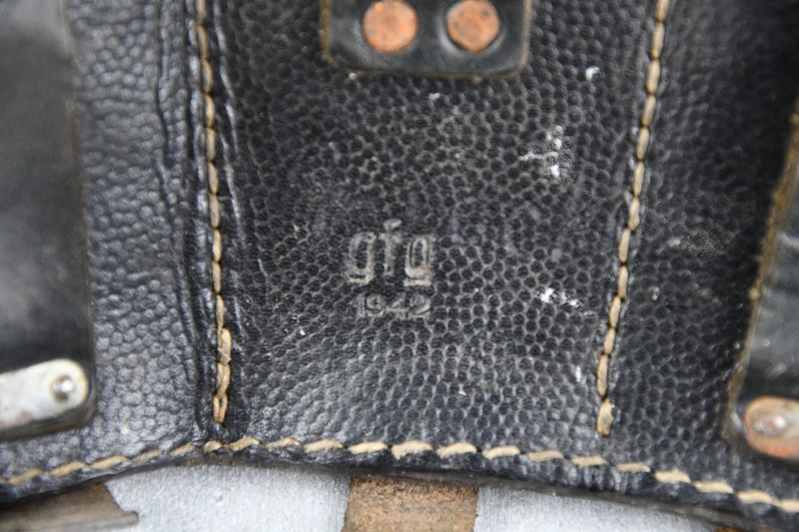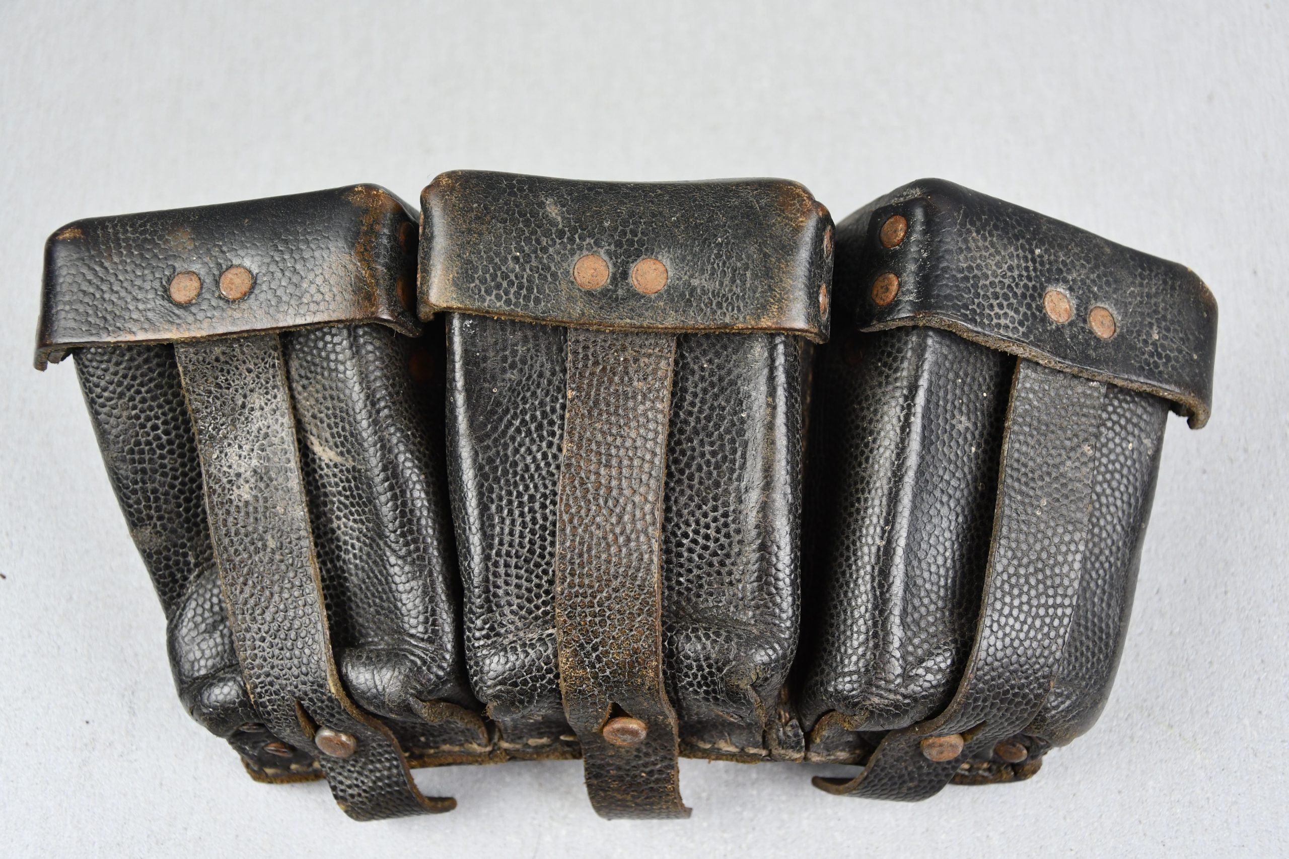 Honest and light worn Wehrmacht/SS K98 ammo pouch in good condition. Complete with spacers intact. Maker marked by gfg (Lederwaren- und GΓΌrtelfabrik Carl Hepting & Co. β Stuttgart-Feuerbach) dated 1942.