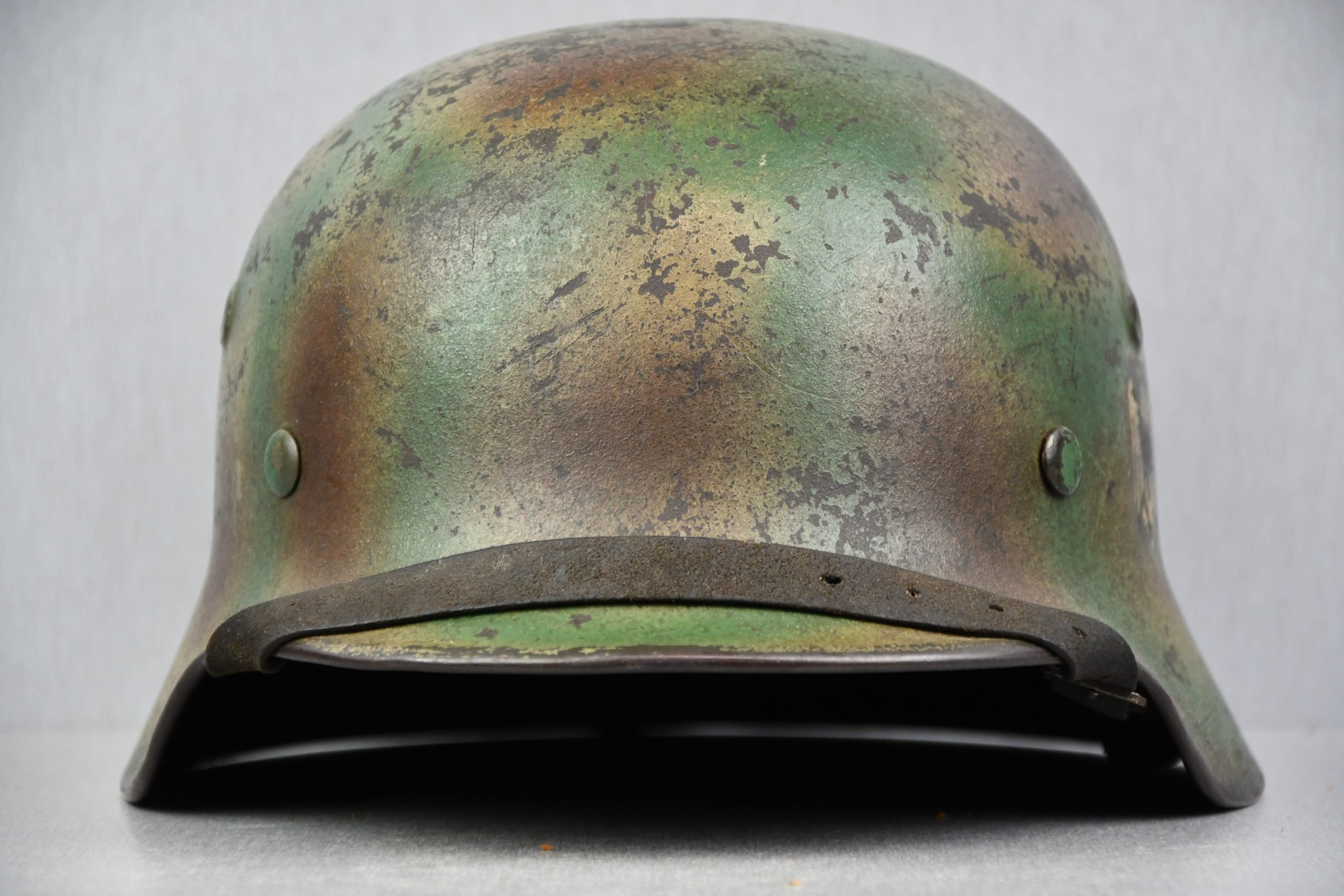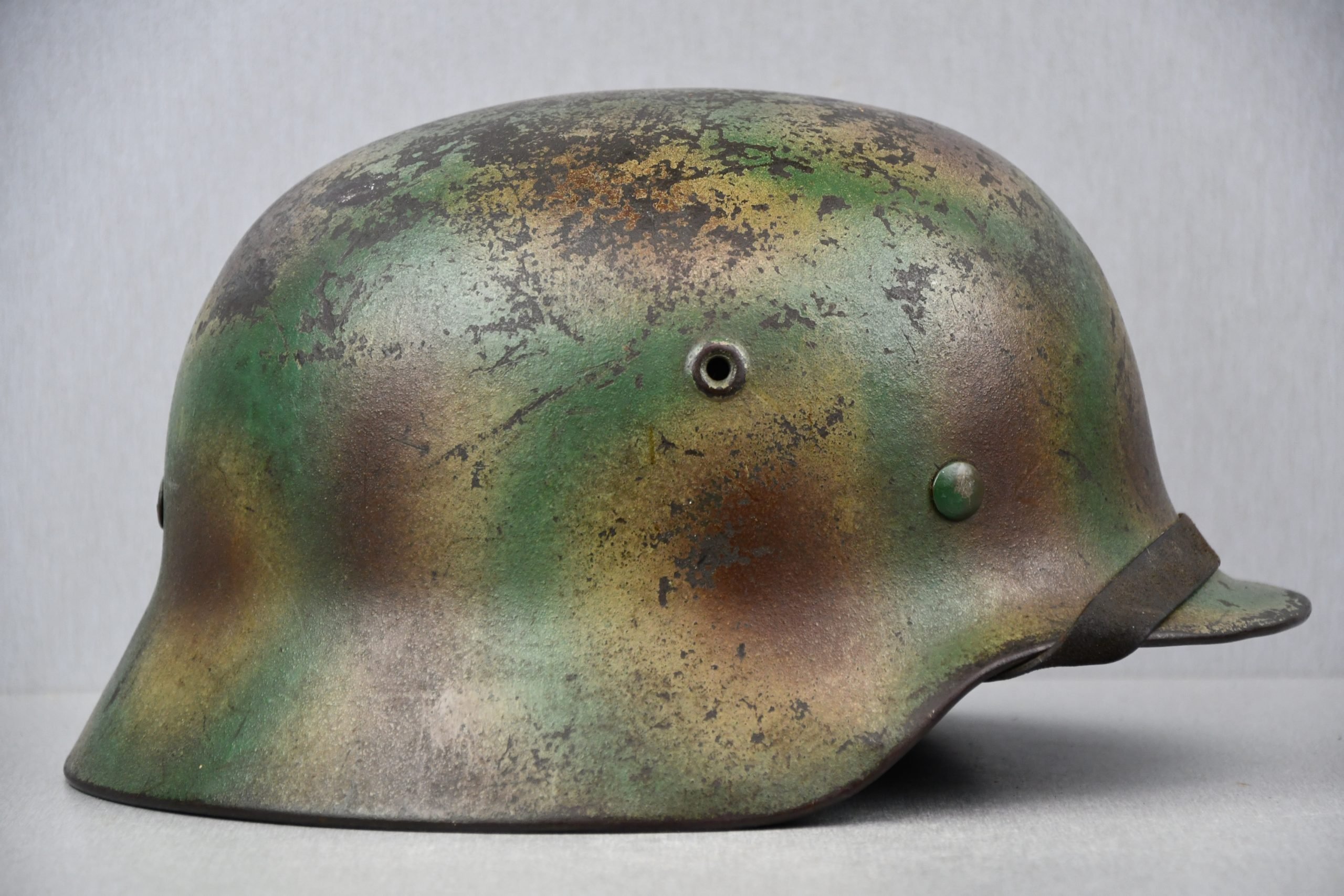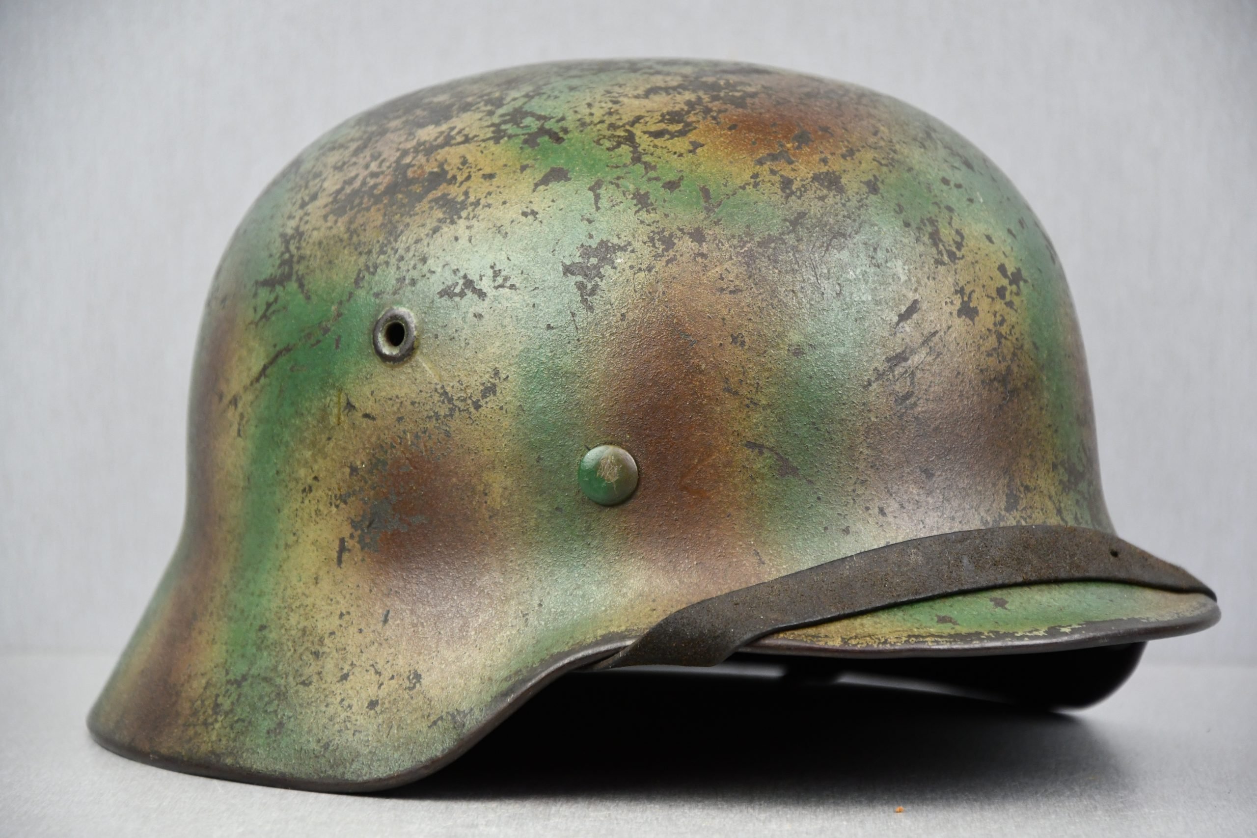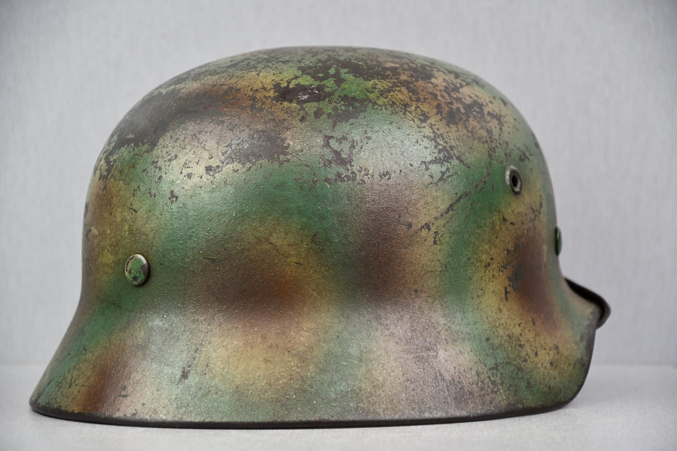 Incredible M40 steel helmet with very desirable camo pattern. Thisparticular patternwith brown/red dots on tan color surrounded by green color is typical for helmets found in The Netherlands in 1944-45. The camouflage paint is applied around the army decal, that still shows nice details. The liner remains in very good condition and is complete with draw string and chin strap. The strap is maker marked and dated 1941. Maker marked shell by EF64, lot number 5011. This helmet could either be issued to the army or Waffen-SS because Frederik (FJM44) was so kind to share a picture from his private collection with these helmets worn by Dutch Waffen-SS volunteers. The picture was taken in The Netherlands during the war.