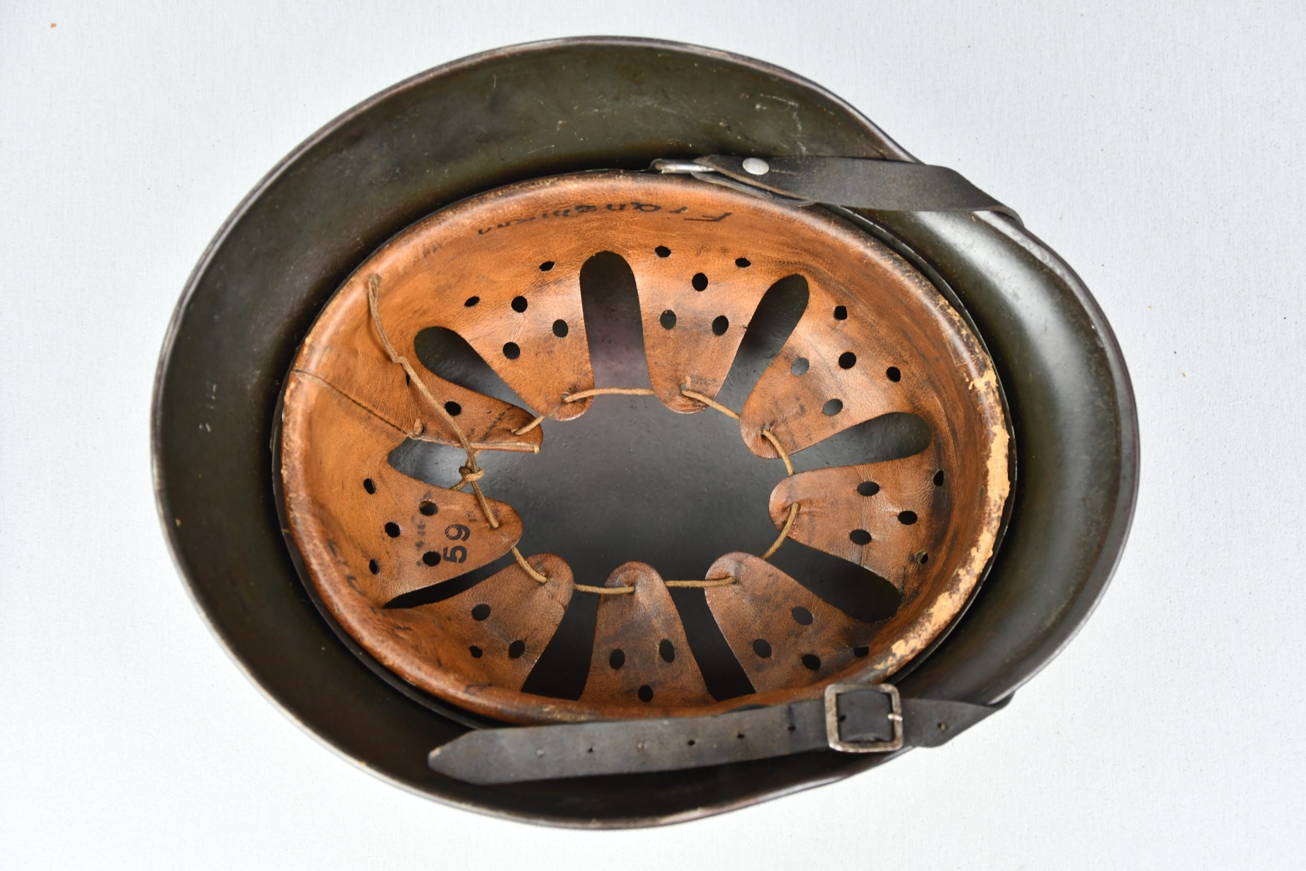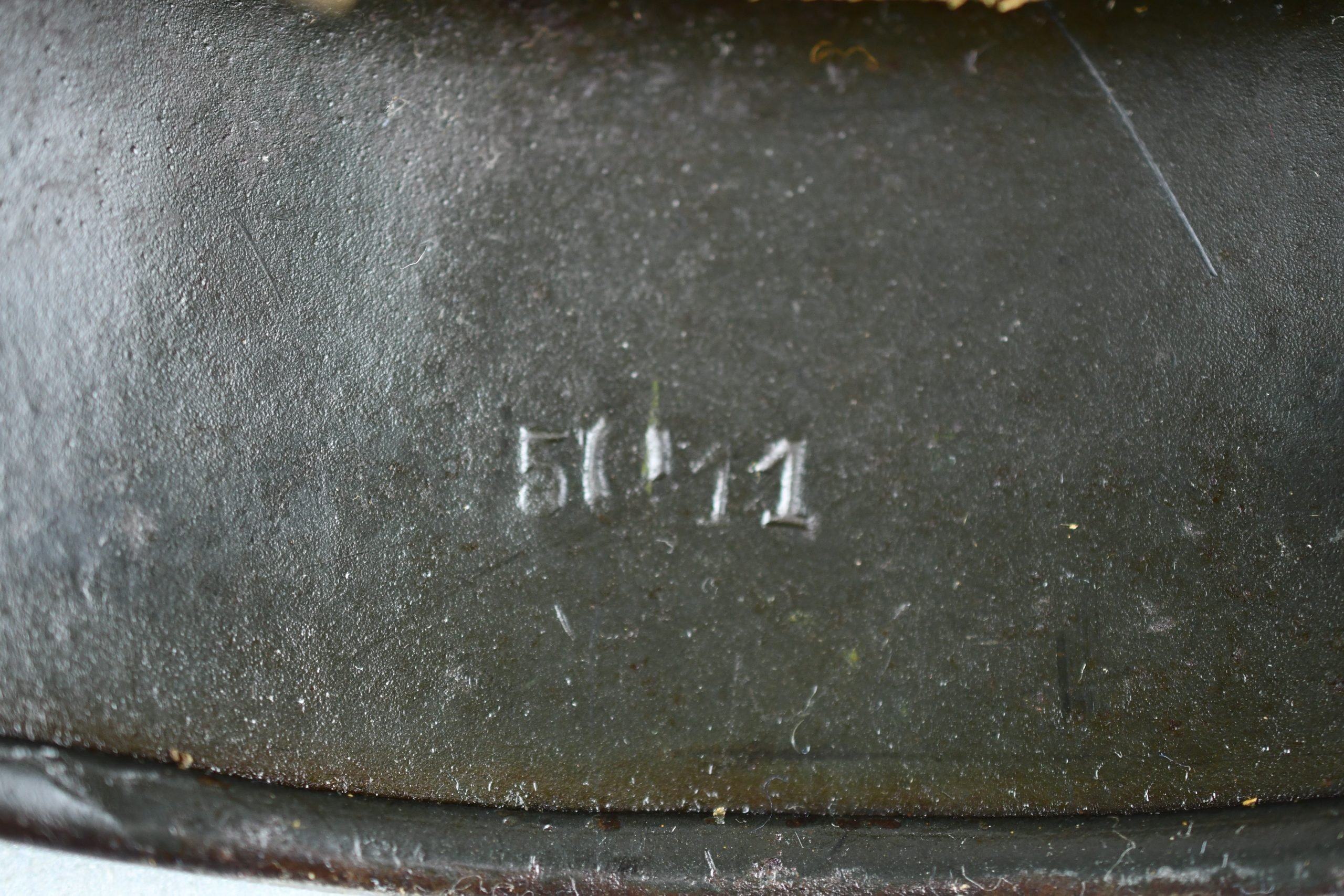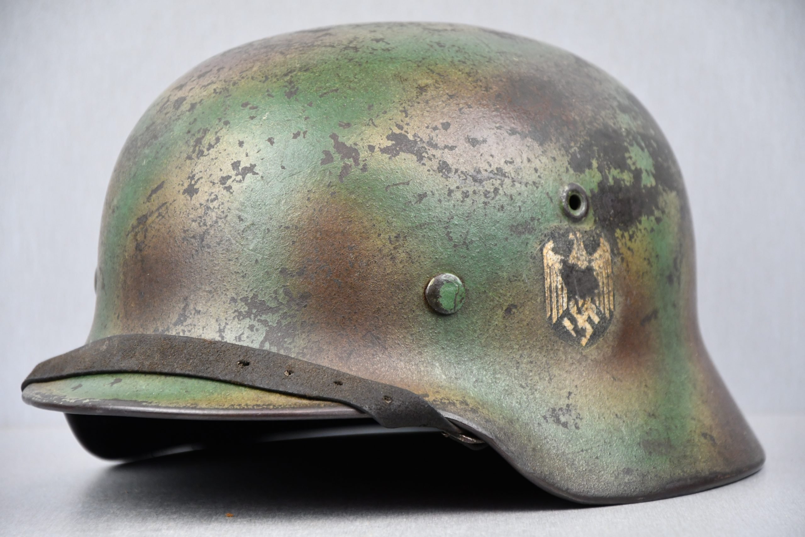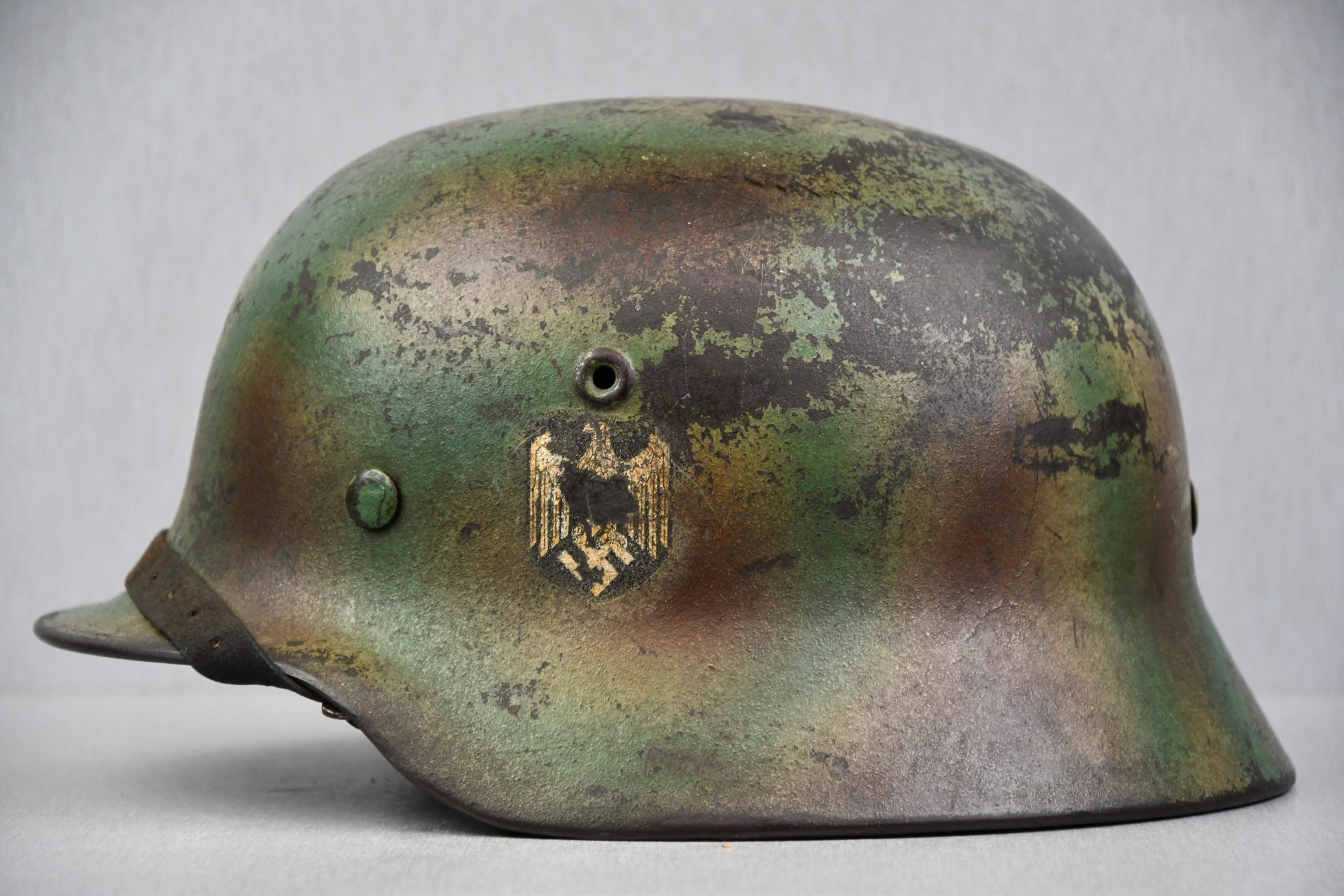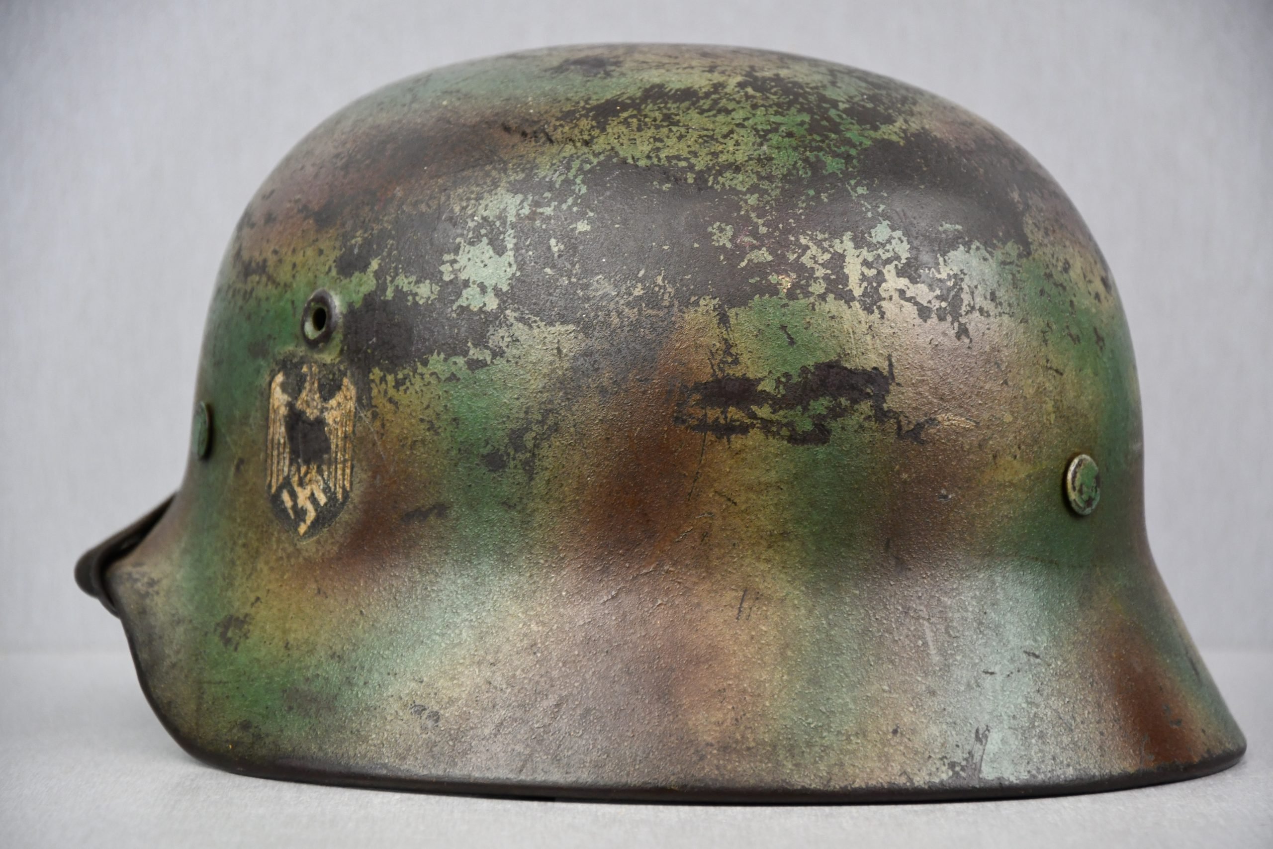 Incredible M40 steel helmet with very desirable camo pattern. Thisparticular patternwith brown/red dots on tan color surrounded by green color is typical for helmets found in The Netherlands in 1944-45. The camouflage paint is applied around the army decal, that still shows nice details. The liner remains in very good condition and is complete with draw string and chin strap. The strap is maker marked and dated 1941. Maker marked shell by EF64, lot number 5011. This helmet could either be issued to the army or Waffen-SS because Frederik (FJM44) was so kind to share a picture from his private collection with these helmets worn by Dutch Waffen-SS volunteers. The picture was taken in The Netherlands during the war.