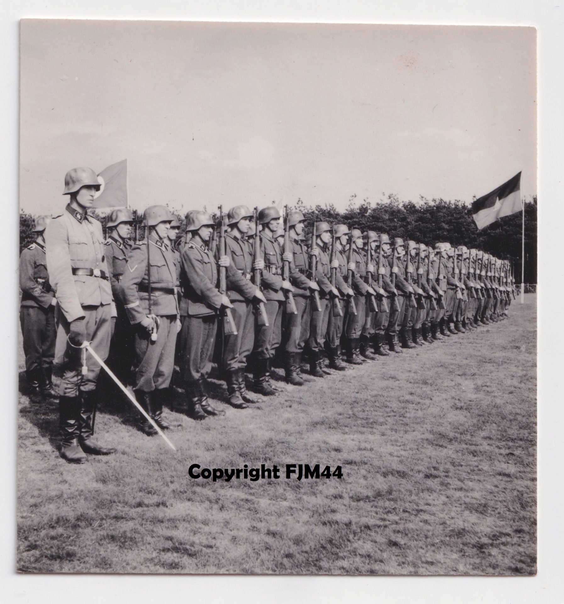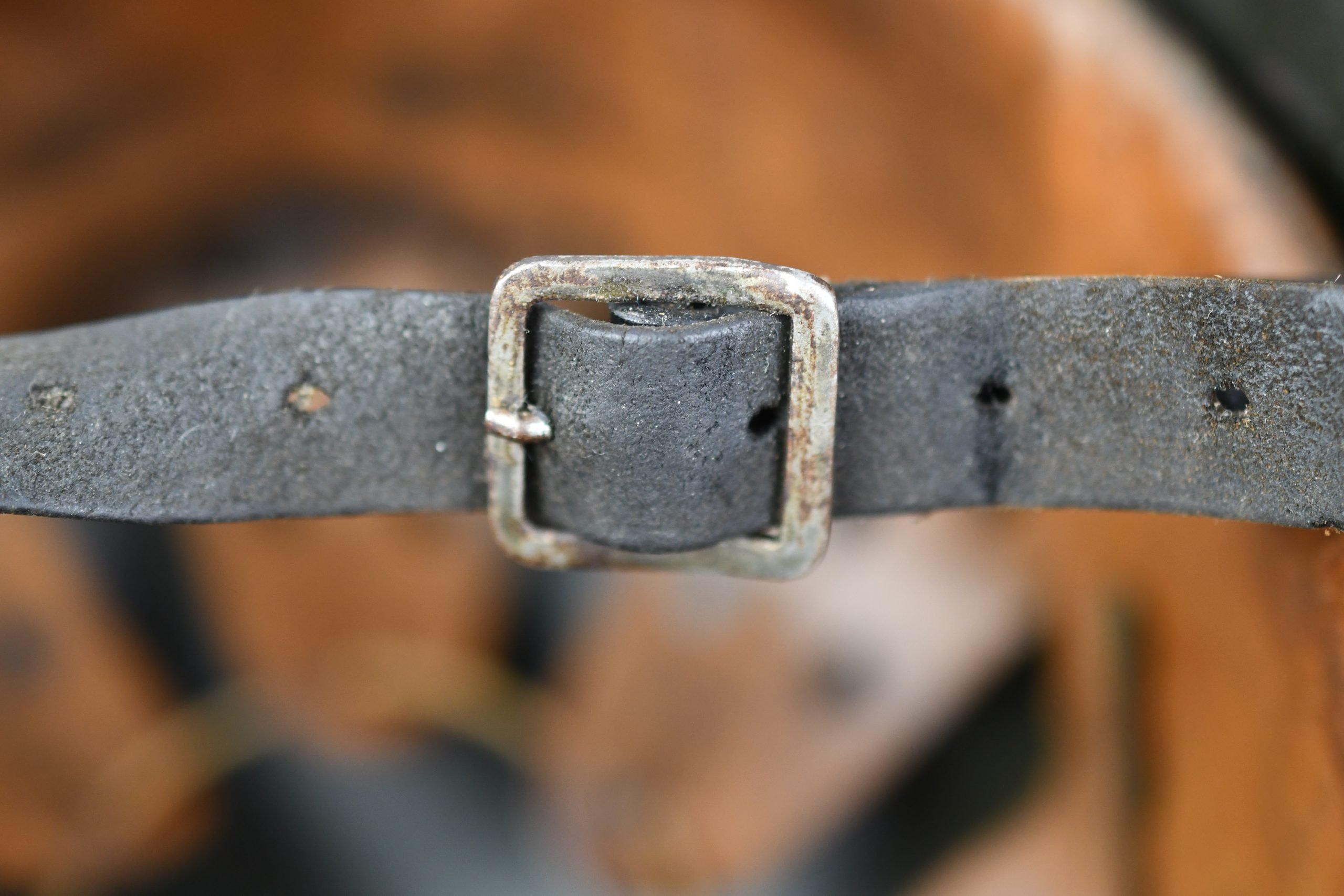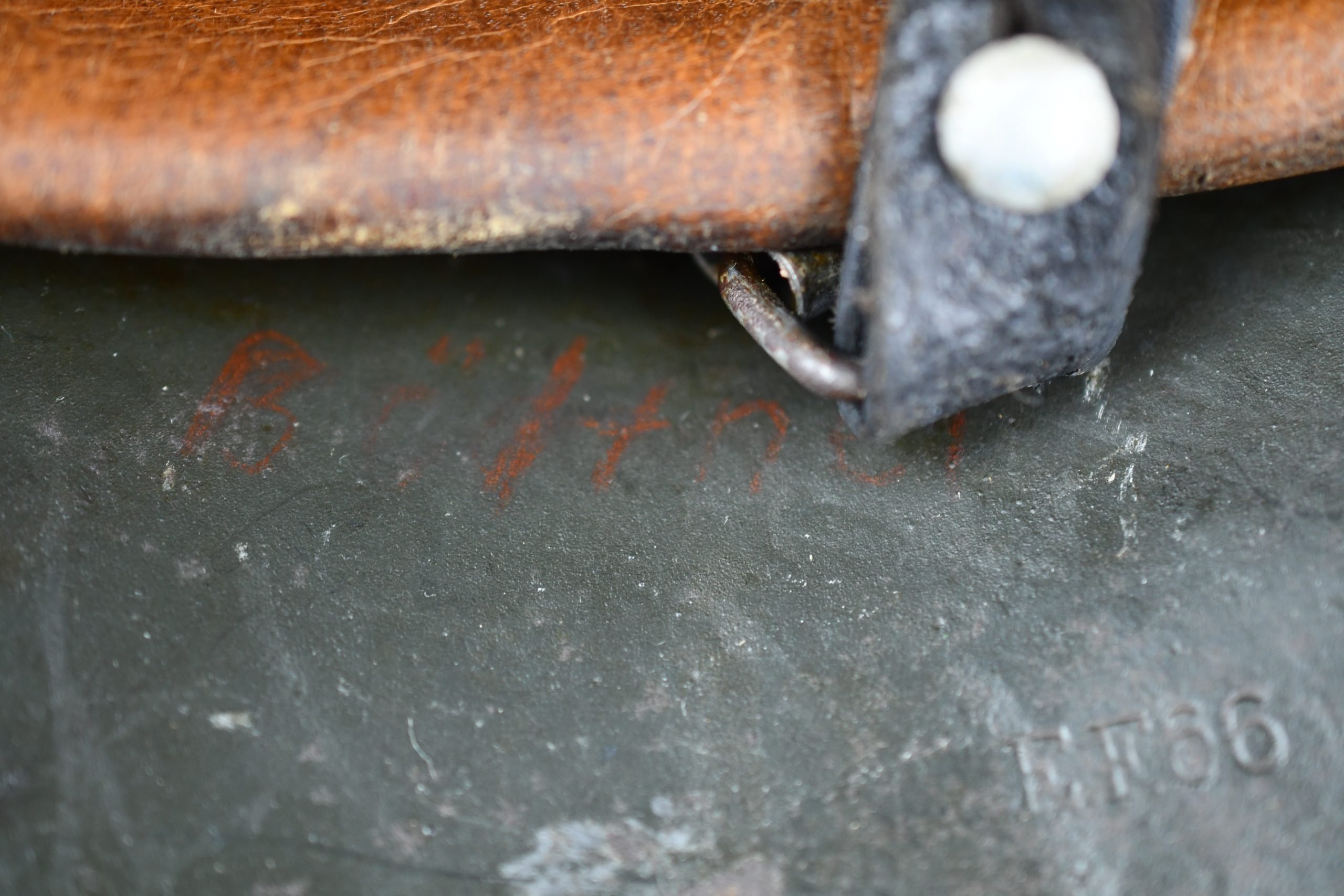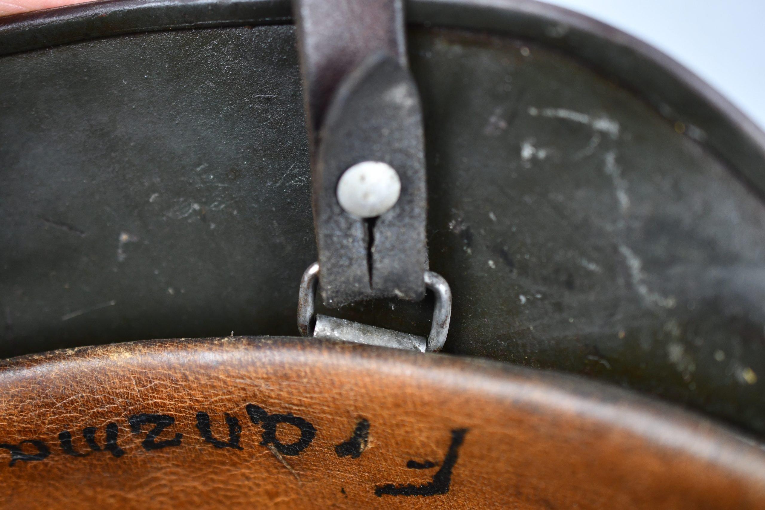 Incredible M40 steel helmet with very desirable camo pattern. Thisparticular patternwith brown/red dots on tan color surrounded by green color is typical for helmets found in The Netherlands in 1944-45. The camouflage paint is applied around the army decal, that still shows nice details. The liner remains in very good condition and is complete with draw string and chin strap. The strap is maker marked and dated 1941. Maker marked shell by EF64, lot number 5011. This helmet could either be issued to the army or Waffen-SS because Frederik (FJM44) was so kind to share a picture from his private collection with these helmets worn by Dutch Waffen-SS volunteers. The picture was taken in The Netherlands during the war.