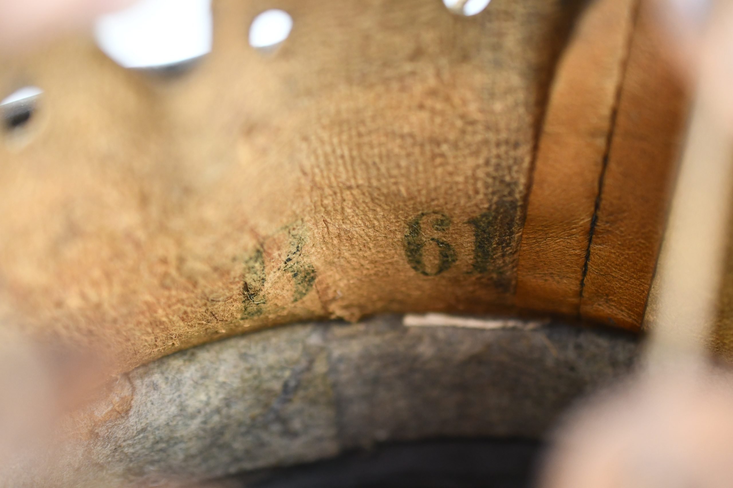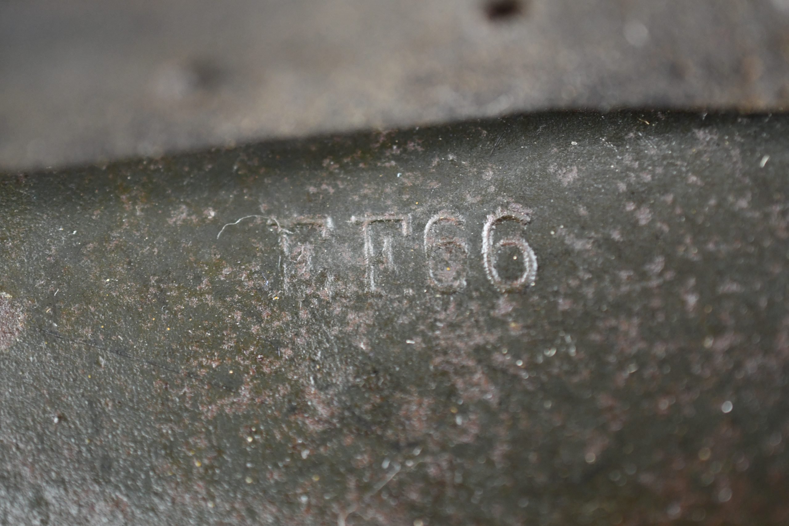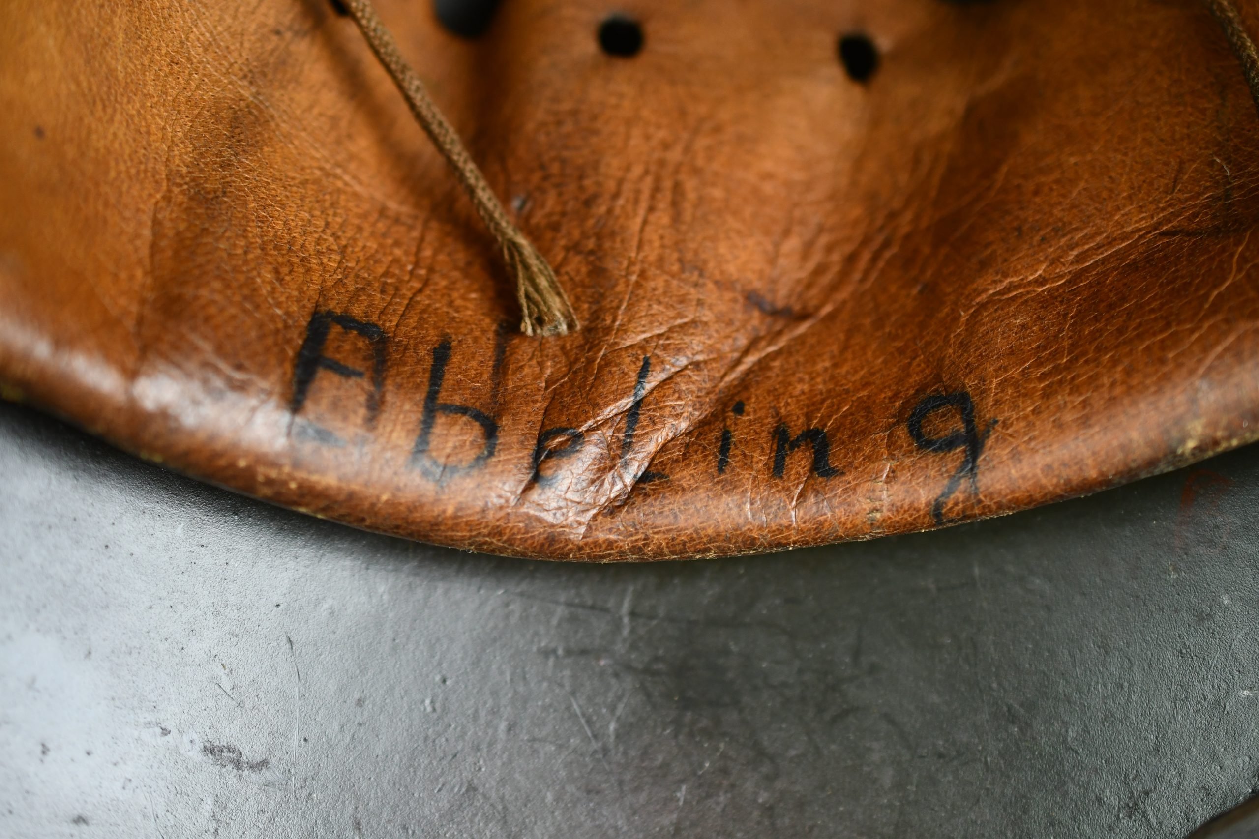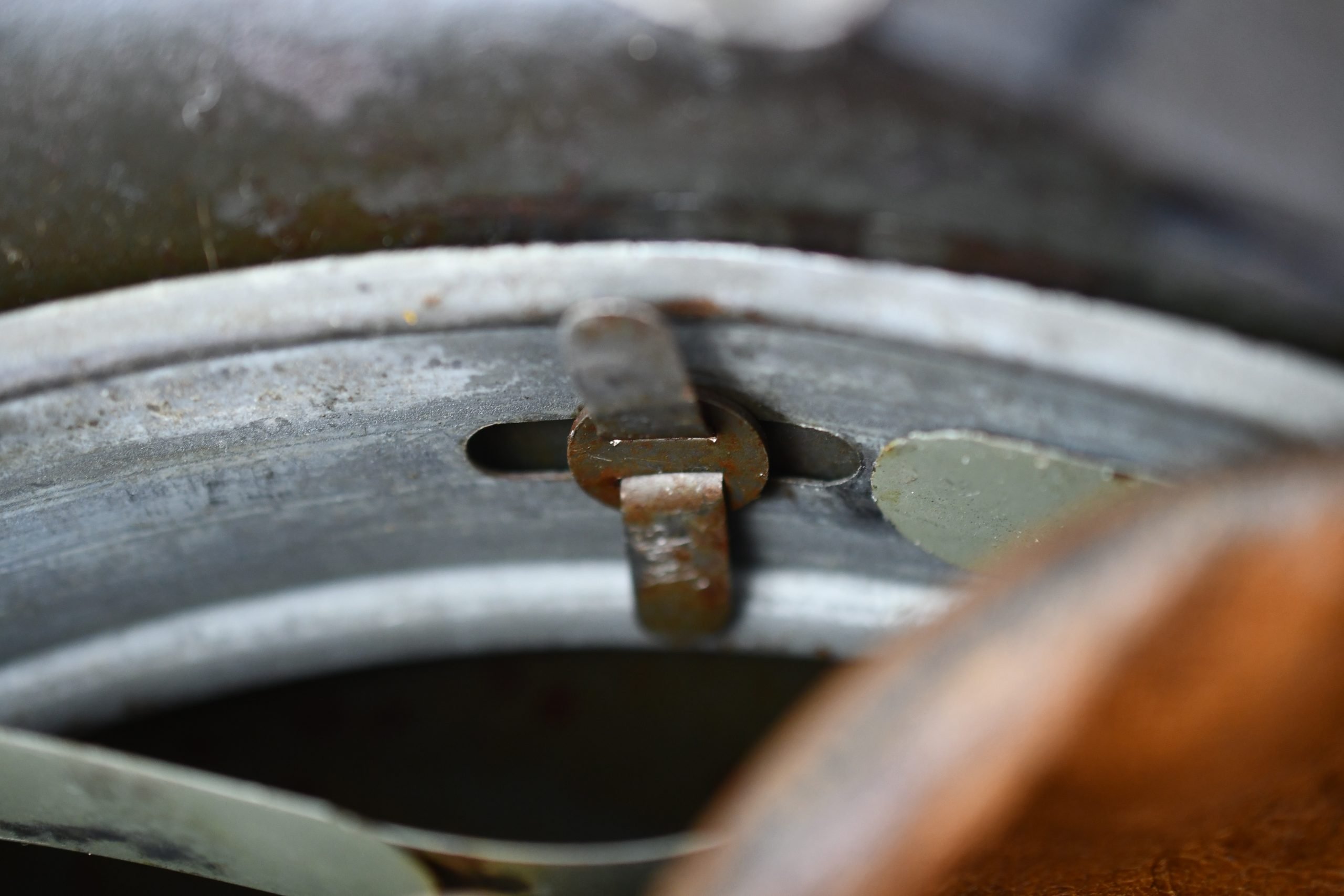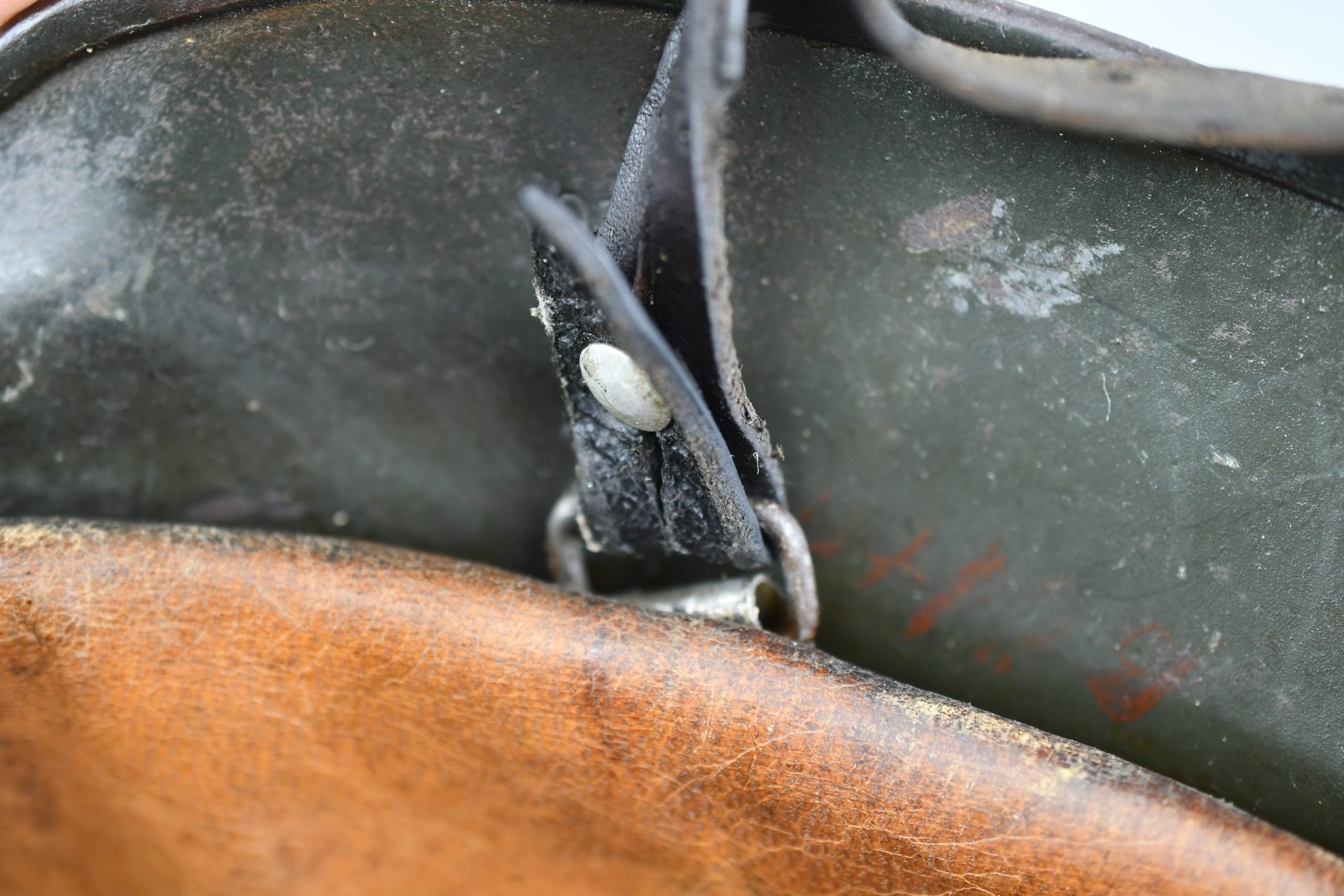 Incredible M40 steel helmet with very desirable camo pattern. Thisparticular patternwith brown/red dots on tan color surrounded by green color is typical for helmets found in The Netherlands in 1944-45. The camouflage paint is applied around the army decal, that still shows nice details. The liner remains in very good condition and is complete with draw string and chin strap. The strap is maker marked and dated 1941. Maker marked shell by EF64, lot number 5011. This helmet could either be issued to the army or Waffen-SS because Frederik (FJM44) was so kind to share a picture from his private collection with these helmets worn by Dutch Waffen-SS volunteers. The picture was taken in The Netherlands during the war.