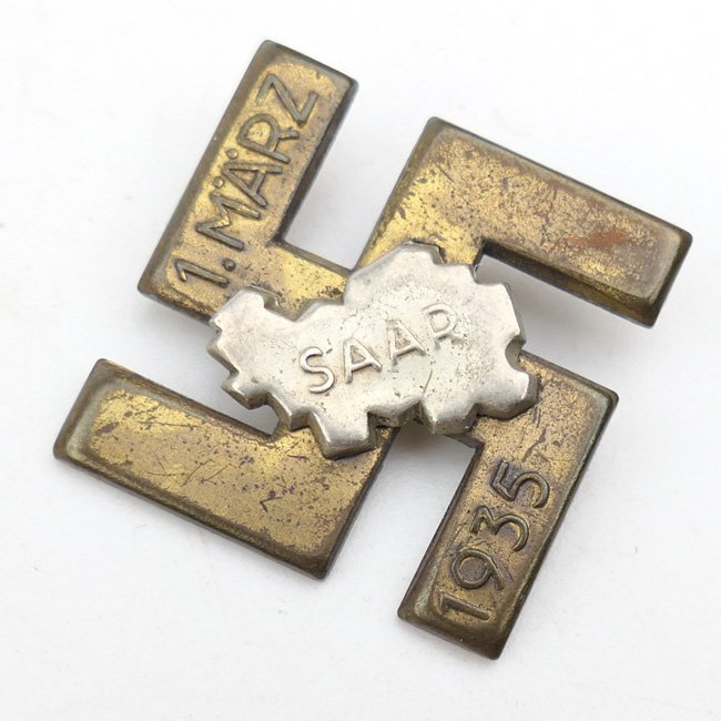 'Saar 1. März 1935' Badge (Erinnerungsabzeichen). This is a tinnie to commemorate the official return of the Saarland with Germany which took place on 1 March 1935. The badge was never recognised as a national award. The badge is maker marked by the company of 'Robinson' from Oberstein. It comes on its functional pin/catch attachment. Nice example in good used condition!