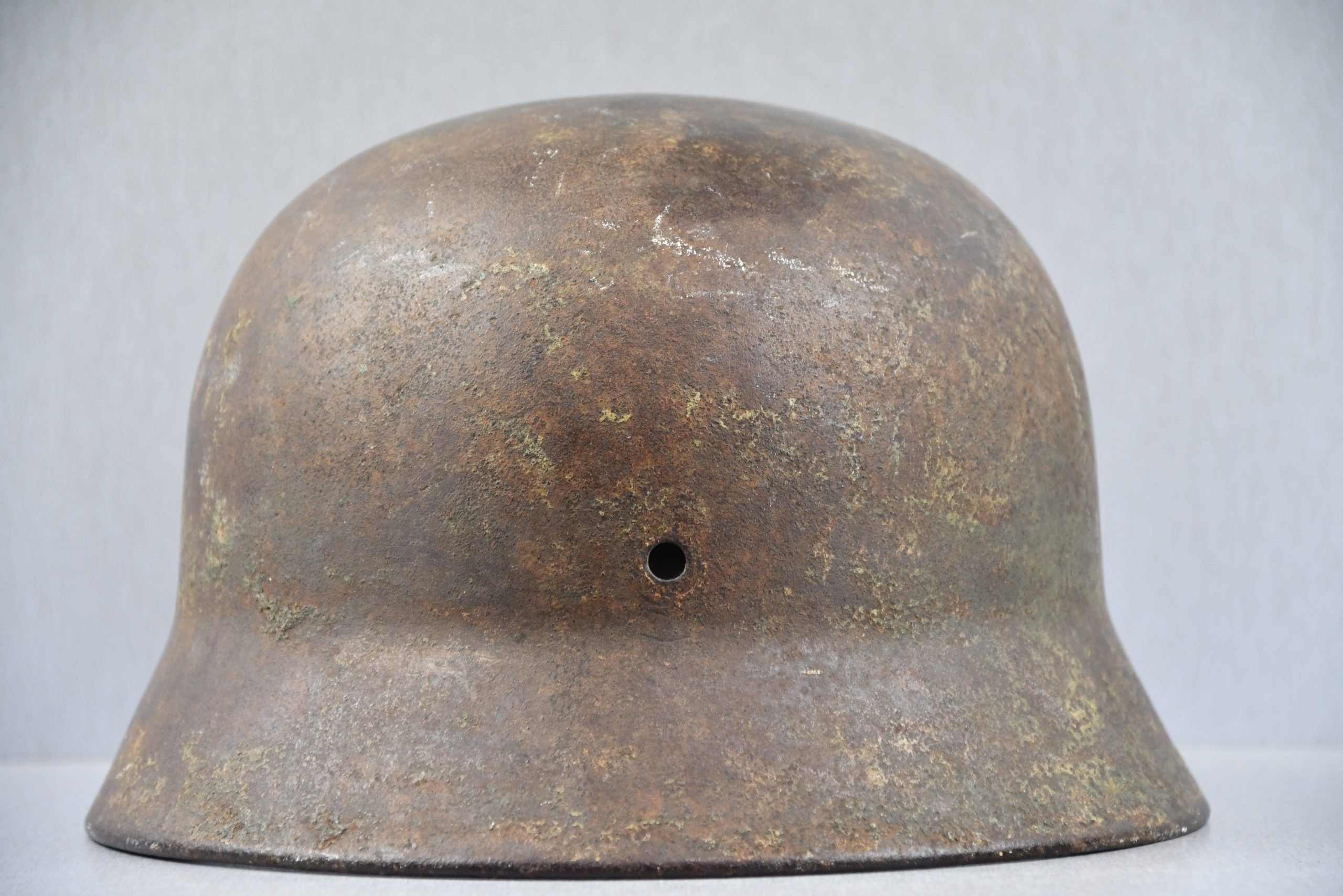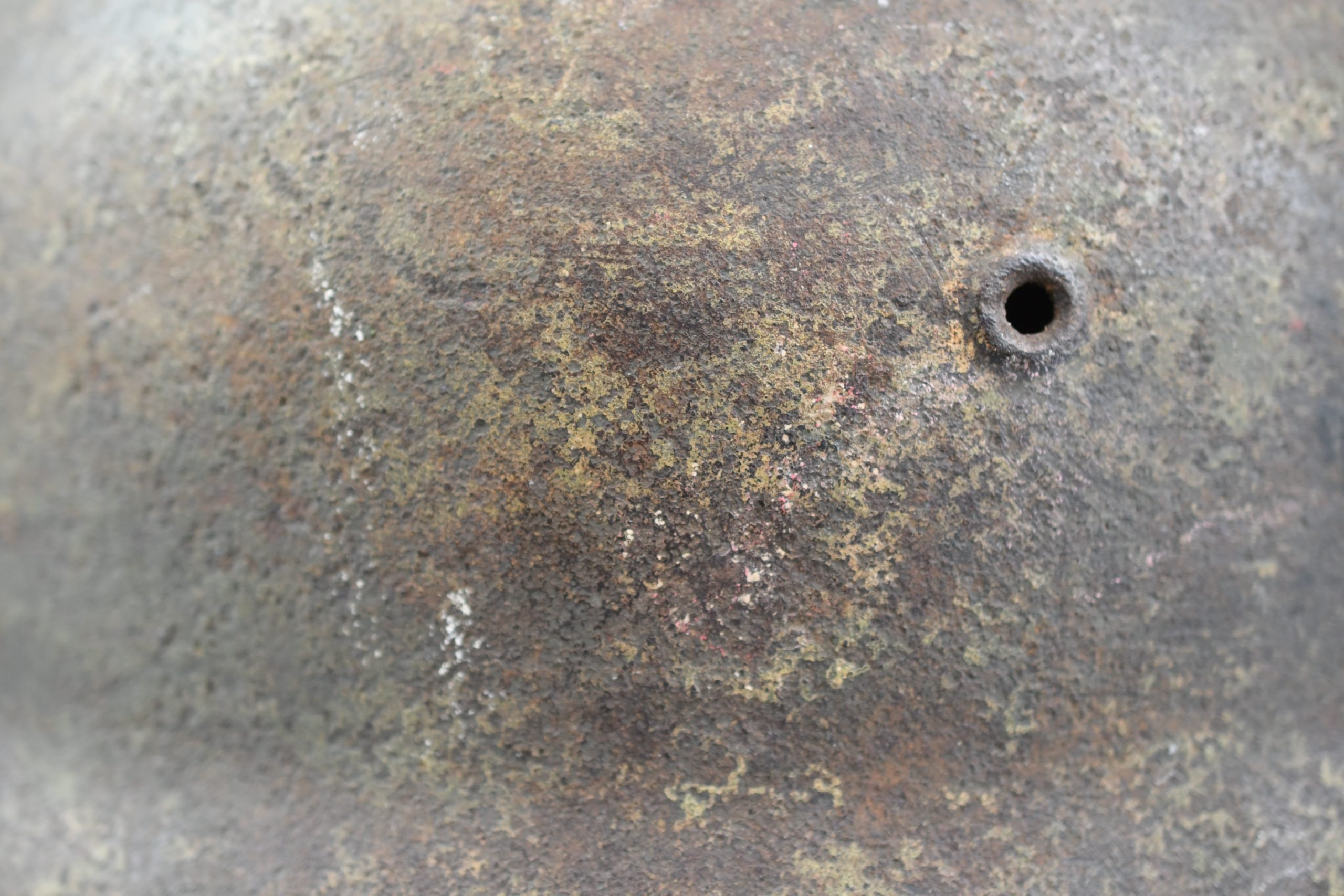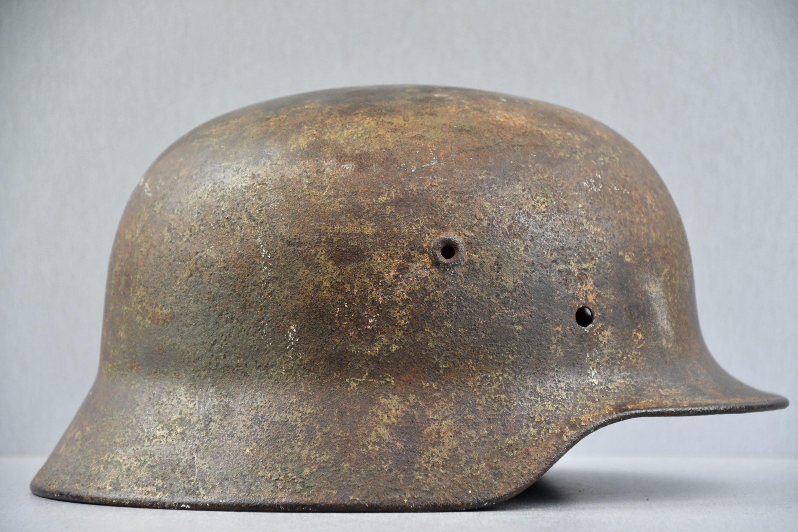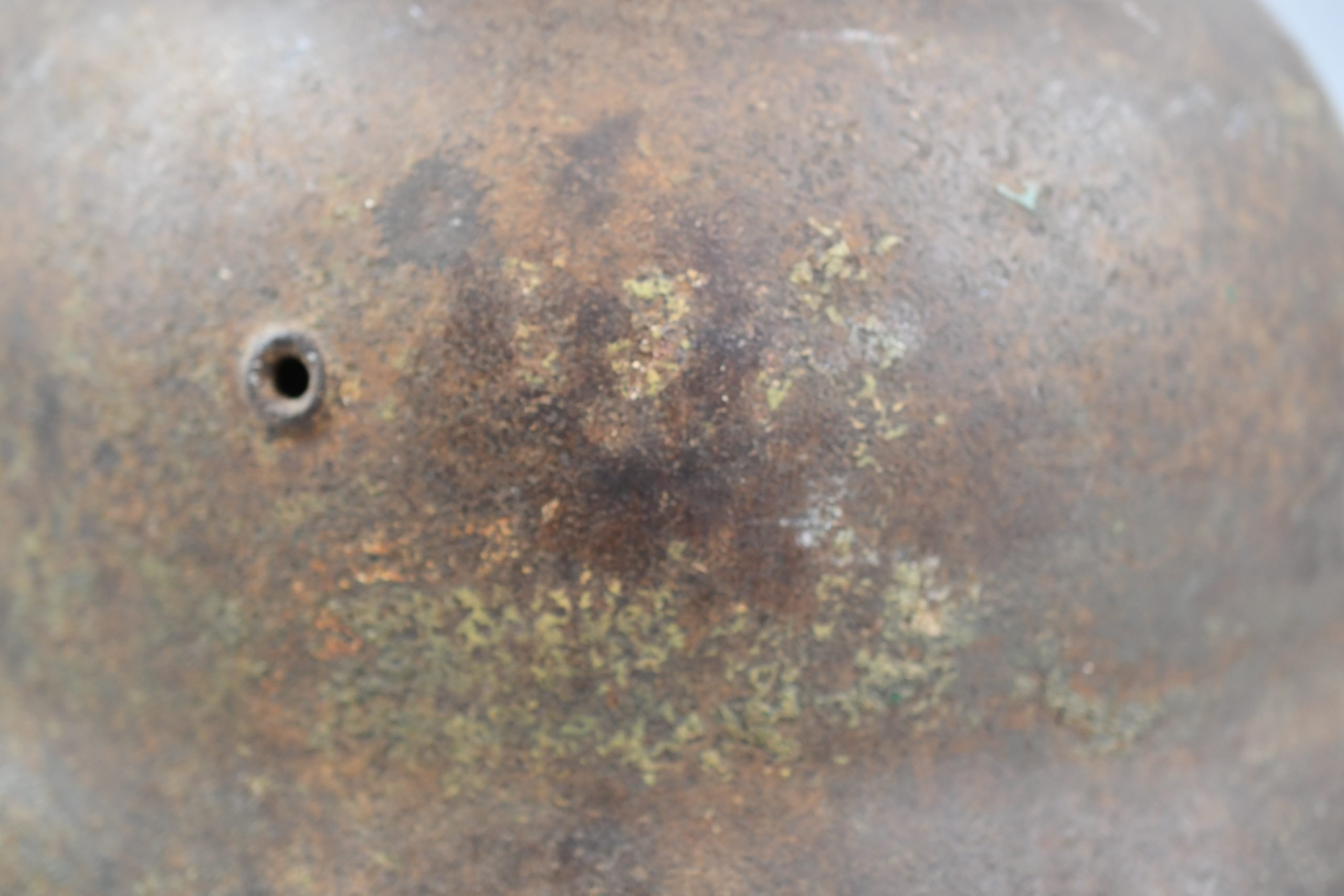 Barn found M40 Luftwaffe steel helmet. Big 68 size, probably made by ET but hard to read. Camouflaged in two-tone colors tan and green. Lot's of wear and patina.