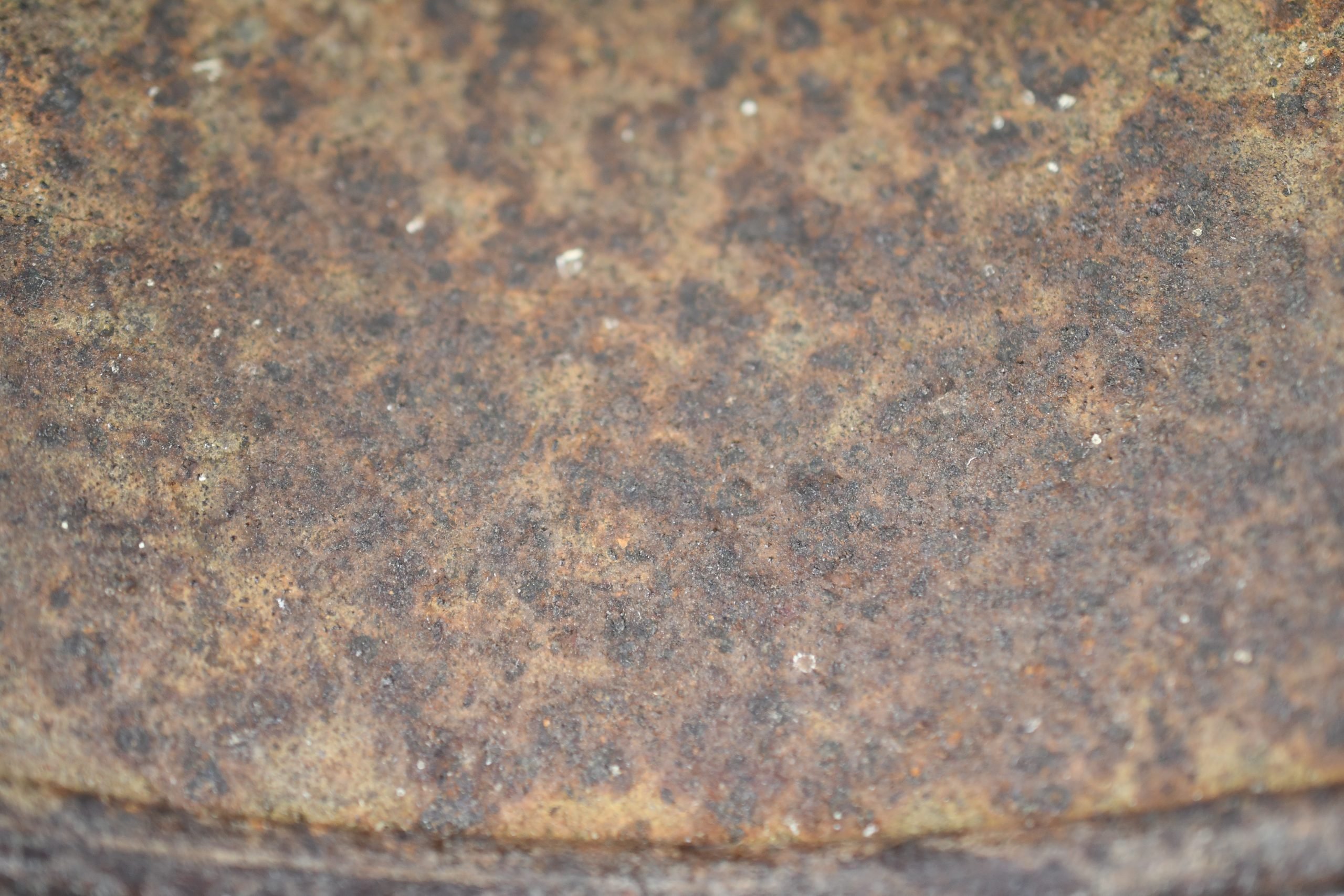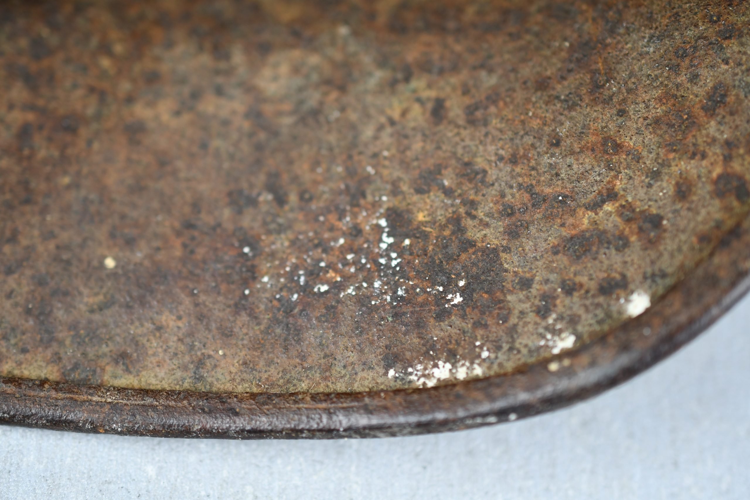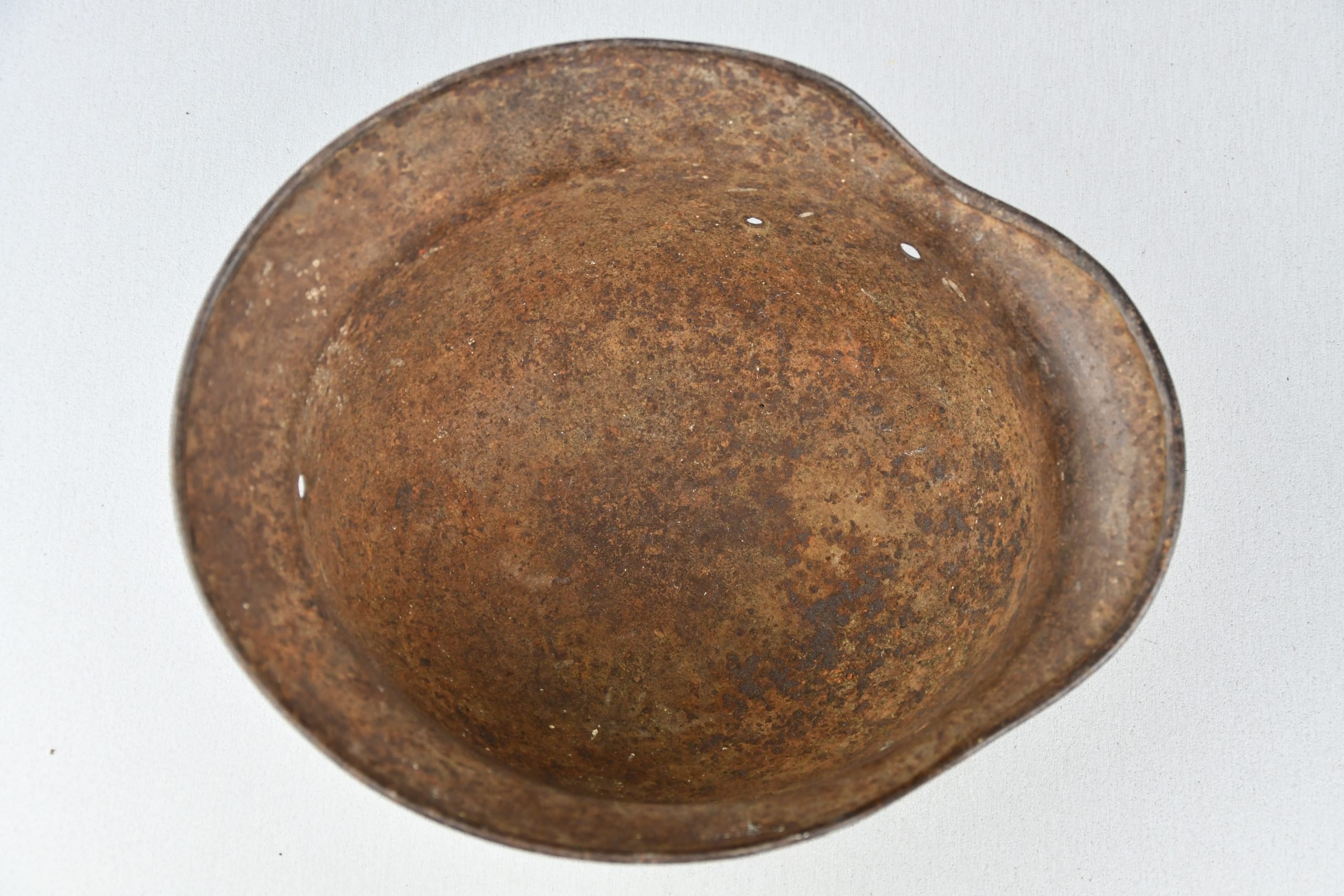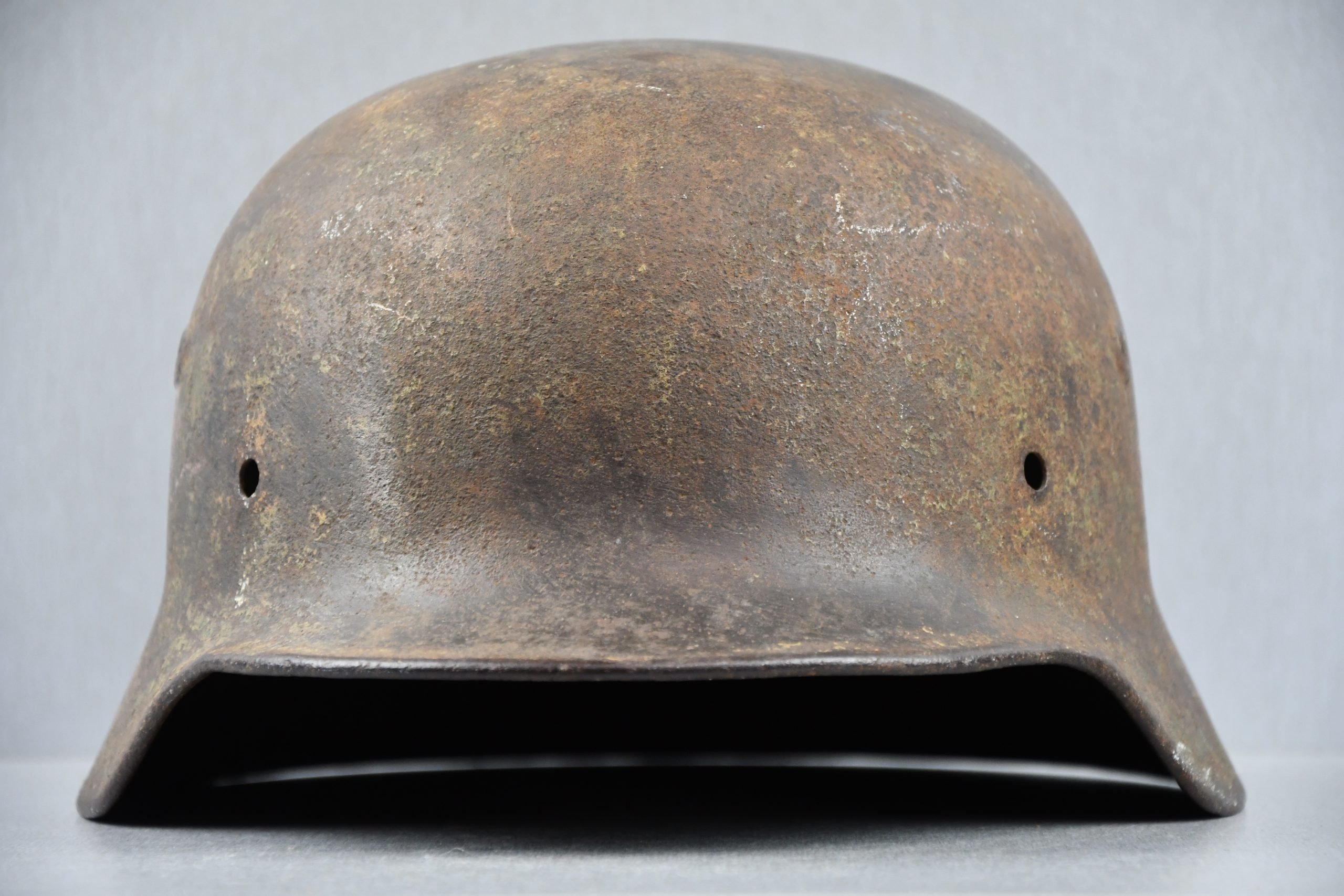 Barn found M40 Luftwaffe steel helmet. Big 68 size, probably made by ET but hard to read. Camouflaged in two-tone colors tan and green. Lot's of wear and patina.
