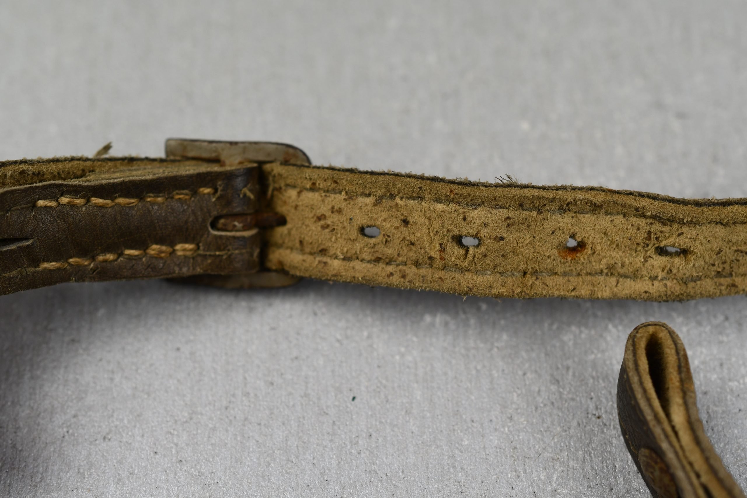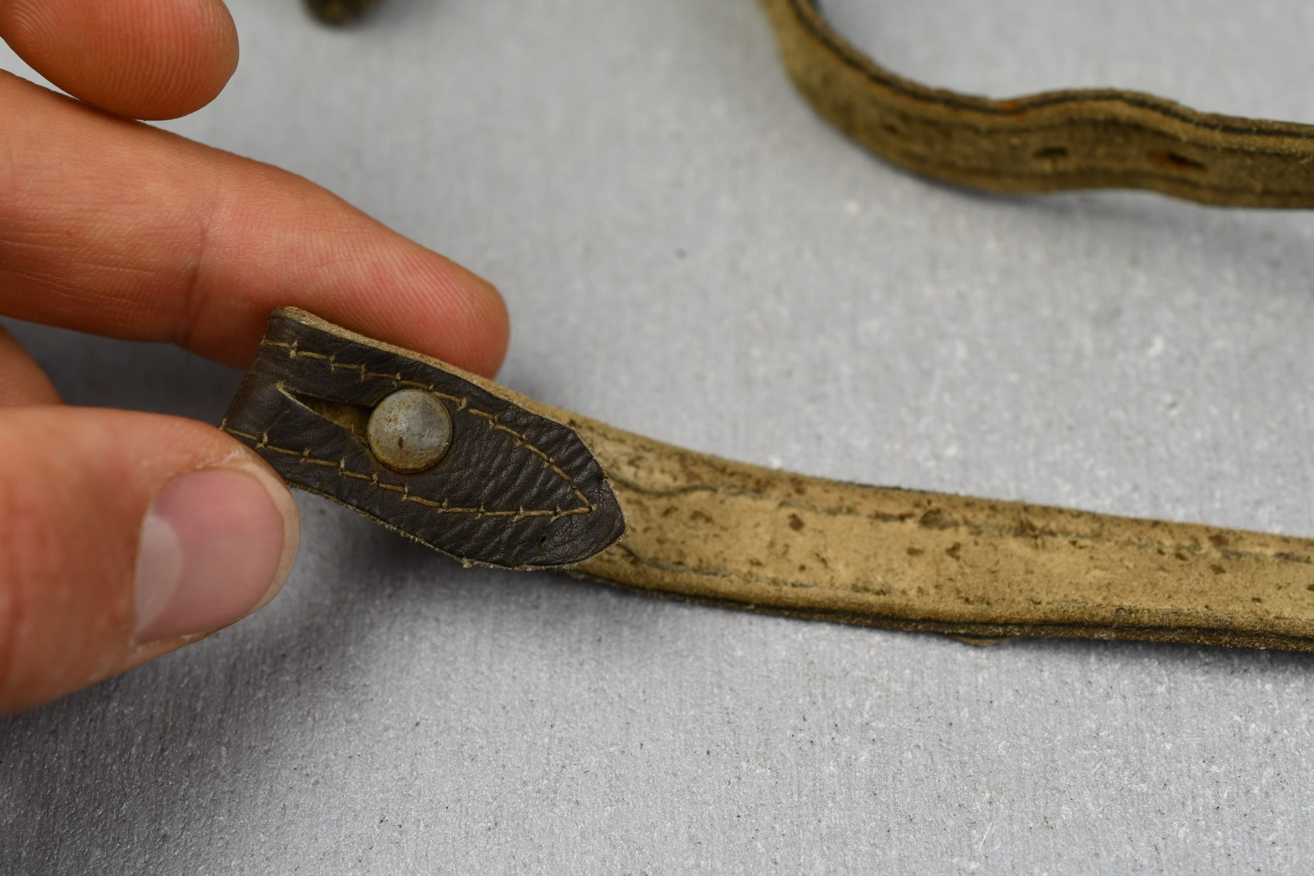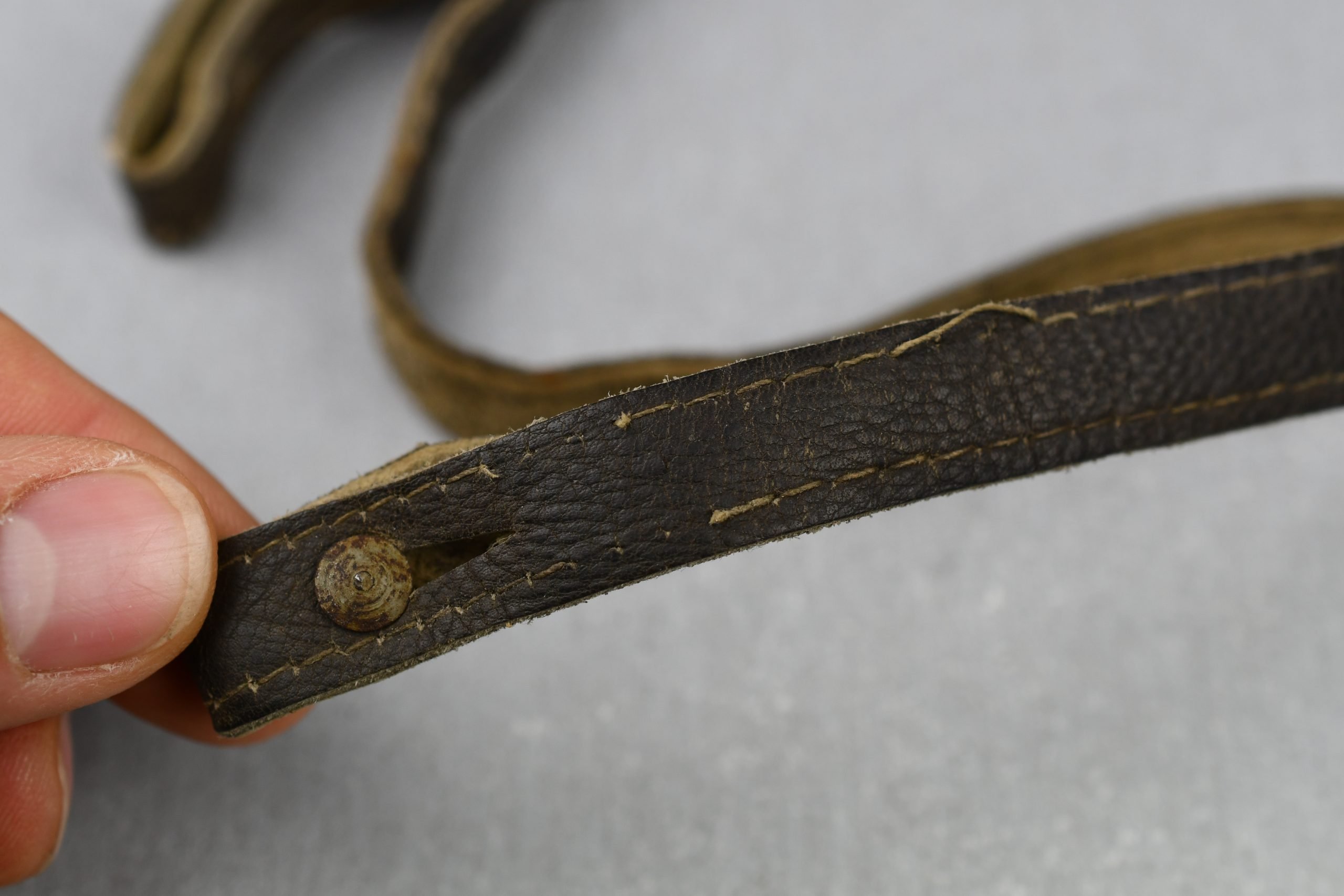 Very desirable and seldom seen German helmet chin strap, late war ca. 1943-44 production. This strap is made just like M38 paratrooper 'Fallschirmjรคger' helmet straps, in the same material with the same stitching on the end. A very nice and ultra rare strap!.