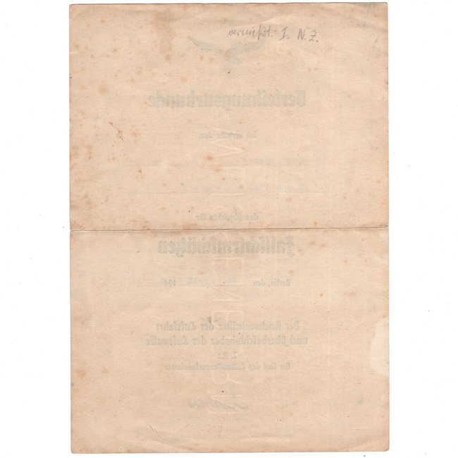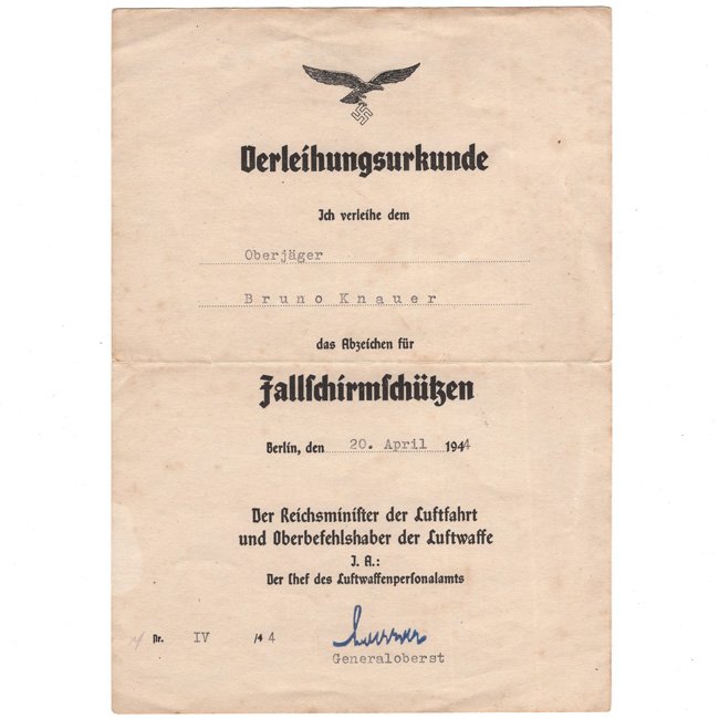 This is an Award Document (Urkunde) for the Paratrooper Badge (Fallschirmschützen Abzeichen). This (DIN A5 sized) document was awarded to Oberjäger 'Bruno Knauer'. This award document has been personally signed by Generaloberst 'Bruno Loerzer', recipient of the Knight's Cross of the Iron Cross. This document has been folded once, see scans. Interesting original document!