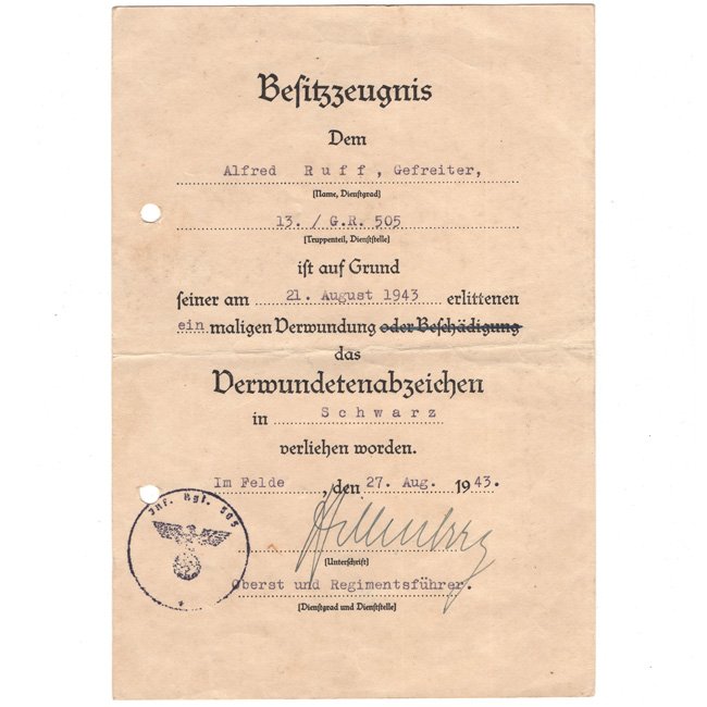 This is an Award Document (Urkunde) for the Wound Badge in Black (Verwundeten Abzeichen in Schwarz). This (DIN A5 sized) document was awarded to Gefreiter 'Alfred Ruff', he served within '13. / G.R. 505' (13. Grenadier Regiment 505'. Alfred had been wounded on August 21. 1943. He was awarded the Wound Badge in Black on August 27. 1943. This document has been folded and perforated, see scans. Interesting original document!