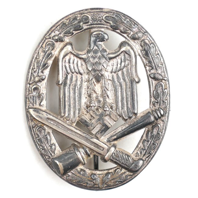 General Assault Badge (Allgemeines Sturmabzeichen). The General Assault badge was introduced on 1 June 1940 by 'Generaloberst Walther von Brauchitsch' for award to support personnel who were ineligible for the Infantry or Panzer Assault badges. Criteria for award of the badge was basically the same as the criteria for award of the Infantry and Panzer Assault badges with the main qualification being participation in three separate assaults in a supporting role. The hollow design tombak (Buntmetall) type badge is not visible maker marked but can be attributed to production by the company of 'Otto Schickle' from Pforzheim. The badge is having a functional pin and catch. The badge still retains a fair amount of its original silver finish and is showing a nice darkened age patina. Nice original early General Assault Badge in good condition!