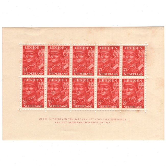 This is a nice 'Legioen Nederland' 7½ cents postage stamp block, consisting of 10 original Dutch postage stamps dating from 1942. These red stamps were sold with an addition of 2½ centsto raise money for the war at the Eastern Front. Underneath the stamps is written:'for the benefit of the provision fund of the Dutch Legion 1942' (uitgegeven ten bate van het voorzieningsfonds van het Nederlandsch Legioen. 1942). The stamps were designed by a member of the NSB, The National Socialist Movement in the Netherlands.Nice block of postage stamps in unissued condition!