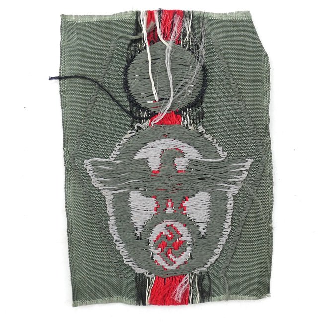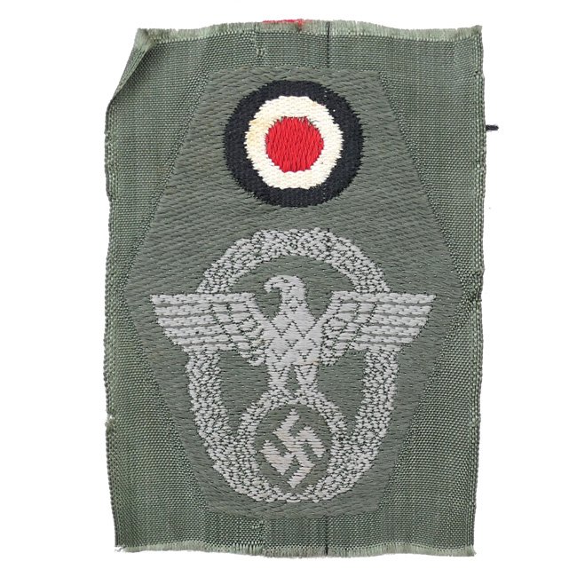 This is a nice example of a 'Polizei' (Police) M43 pattern BeVo-woven combined cap-eagle and cocarde. The eagle is executed in silver-grey coloured linnen on a fieldgrey coloured linnen background. Nice original cap insignia in mint and unissued condition!