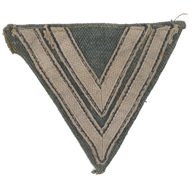 Wehrmact (Heer) Obergefreiter's or Waffen-SS 'Rottenführer' Rank Chevron (Armwinkel). The newly formed Wehrmacht Heer introduced a new system of sleeve rank insignia for wear by the enlisted ranks on 25 September 1936. Insignia with one chevron indicating the rank of Gefreiter, two chevrons for the rank of Obergefreiter, and two chevrons with one pip for the rank of Stabsgefreiter. These chevrons were worn on the upper left sleeve of the tunic and Greatcoat. The chevron is executed in HBT (Drillich) material having two V-shaped bands of subdued, matte grey rayon attached indicating the rank of 'Obergefreiter' or 'Rottenführer'. Nice original example in good used condition!