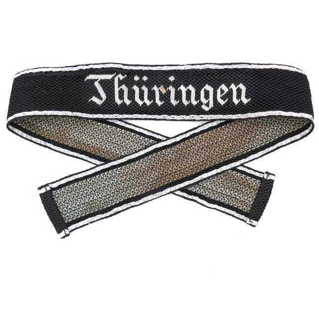 SS-Totenkopfverbände Standarte 'Thüringen' flat-wire Cufftitle (Ärmelband), intended for members of the SS-Totenkopfstandarte 'Thüringen' (Weimar-Buchenwald). The cuff title is woven in flat-wire thread on black background. The cufftitle shows the woven script 'Thüringen'. The cufftitle is in full length condition measuring 47cms in length. The cufftitle is in good used condition showing some staining and one small repair left above the script 'Thüringen, see photos. Rare original cufftitle!