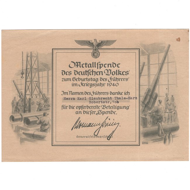 This is a nice original Metal Donation Paper Certificate (Urkunde fΓΌr die Metallspende des deutschen Volkes), dated 1940. People who contributed to this collection of metal (for the war industry) received these certificates. The certificate is in good condition and measures approximately 21 x 14,5 cms in size. Decorative original certificate!