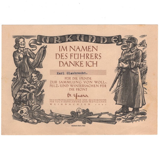 This is a nice original Wool, Fur and Winter Items Donation (Urkunde fΓΌr die Spende zur Sammlung von Woll, Pelz und Wintersachen fΓΌr die Front) paper certificate. People who contributed to this collection of these materials (for the war industry) received these certificates. The certificate is in good condition and measures approximately 21 x 14,5 cms in size. Decorative original certificate!