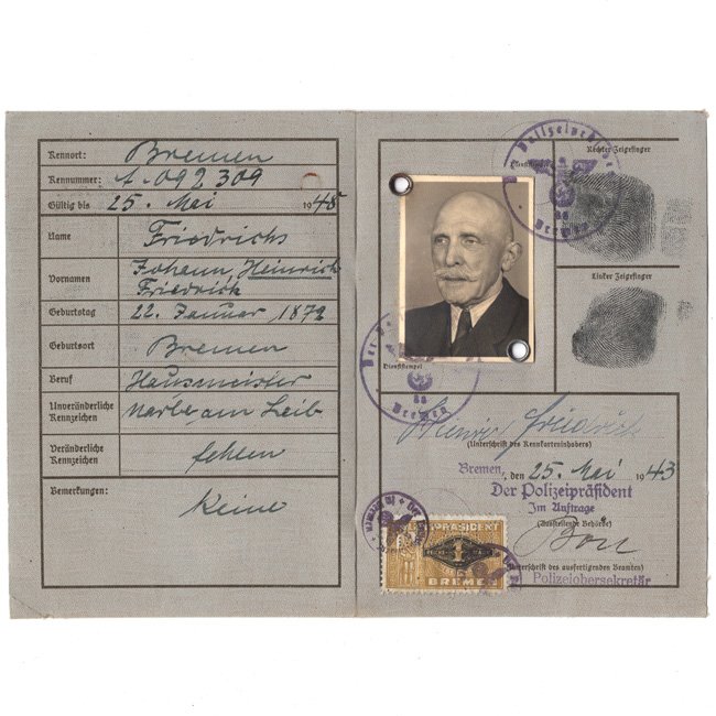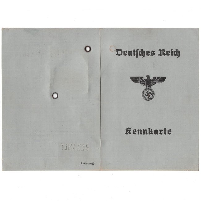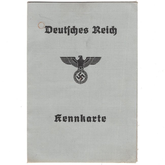 'Deutsches Reich Kennkarte' - Civil Indentification Card. Introduced in July 1938. Every German citizen was issued one, and was expected to show it when asket to by officials. This ID-card belonged to a man from the area of Bremen, it was issued to him on May 25 1943. The oilcloth ID-card is in excellent condition. Nice original example!