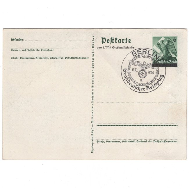 This is a nice original colourful postcard of the annexation of the Sudetenland. The card shows an artistic image of the territory of the Sudetenland with a picture of Adolf Hitler being greeted by people. There's a decorative ink stamp at the back. Unfortunately the postcard is in slightly damaged condition (folds), see scans. The postcard measures approximately 15 x 10,5 cm. in size. Nice and decorative original postcard!
