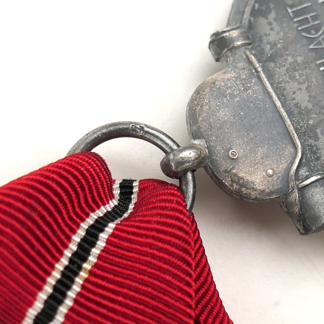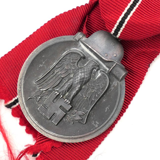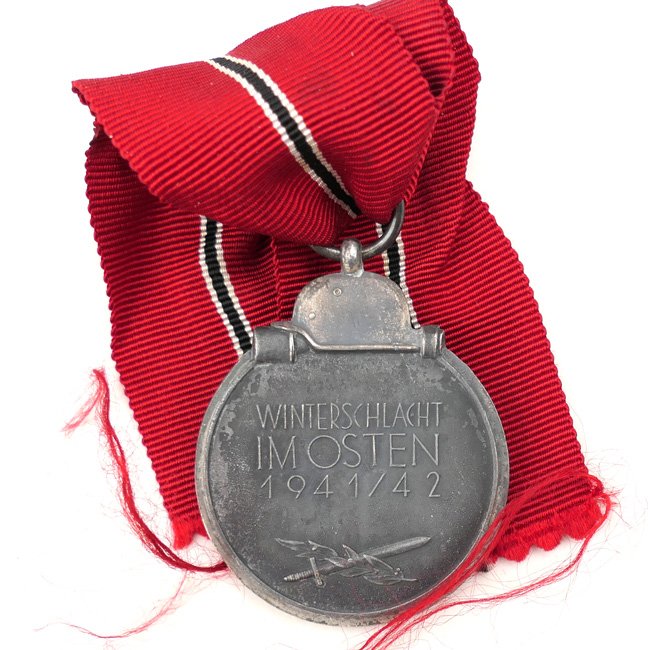 German Eastern Front Medal (Medaille fΓΌr die Winterschlacht im Osten). The German Eastern Front Medal (Medaille fΓΌr die Winterschlacht im Osten) was instituted on 26 May 1942 to commemorate the first winter campaign in Russia, operation Barbarossa. The medal was also known as the 'Frozen Meat Medal'. Approximately 3 million examples have been awarded. The medal is maker marked with number '6' indicating production by the company of 'Fritz Zimmermann' from Stuttgart. The medal is complete with its original ribbon as found. Nice example in good used condition!