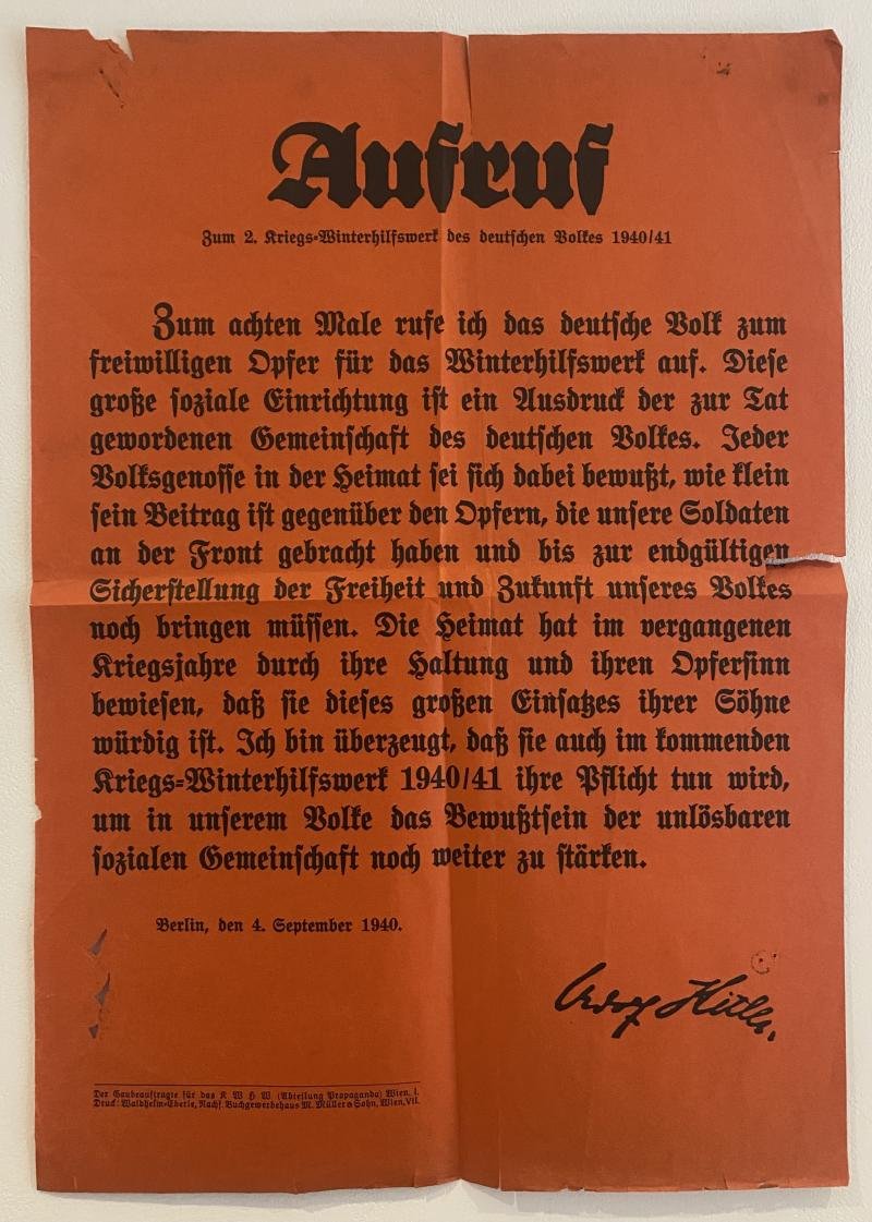 Original 1940/41 Winter Relief Fund appeal poster. Outlining a small financial contribution to the war effort is small compared to the sacrifices of the soldiers fighting in the frontlines. Issued by the propaganda department of Vienna on behalf of Adolf Hitler. Poster approx 61cm X 43cm. Printed on wafer thin paper. Nice original piece, some creases and small rips. Ideal for displaying in a frame. Poster will be recieved folded. Poster comes with a hand written accurate translation.