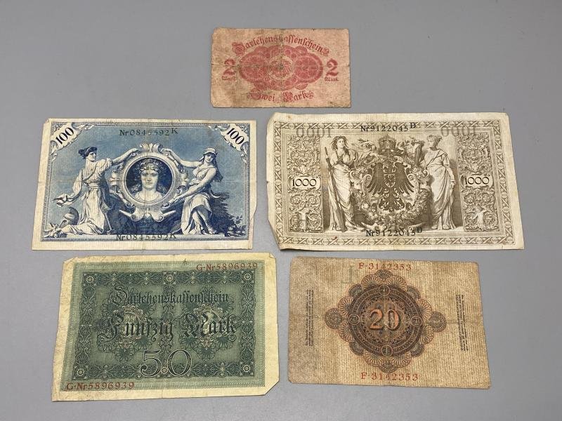Original German circulated bank notes from WW1 and just before.20 Mark 191050 Mark 19141000 Mark 1910100 Mark 19082 Mark 1914