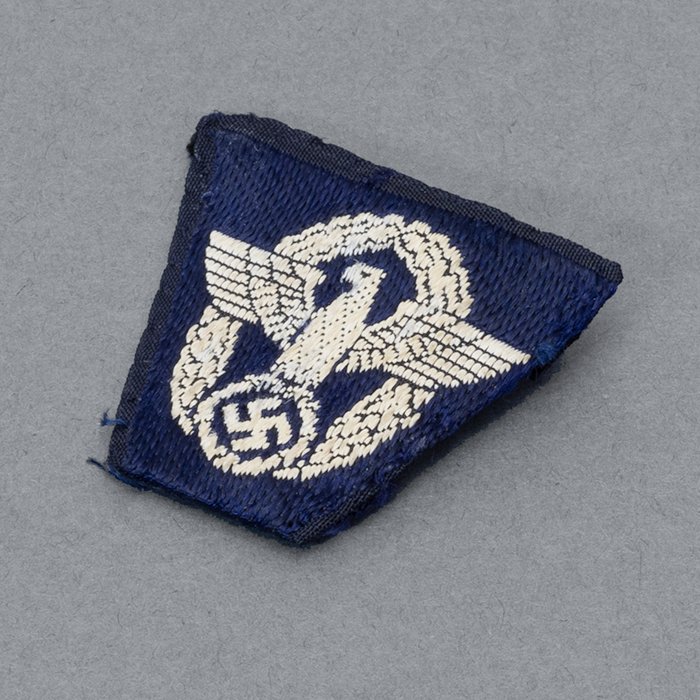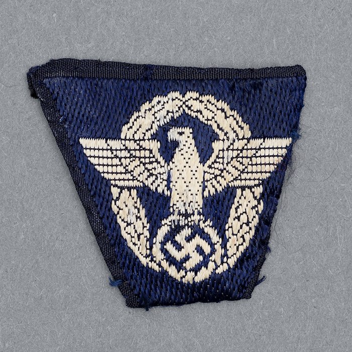 Machine woven emblem removed from a blue Schutzpolizei or Feuerschutzpolizei EM overseas cap, having off white threads on a dark blue field, with light soling, USD $55
