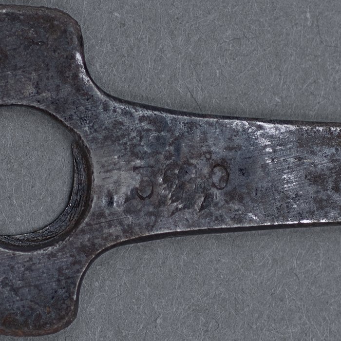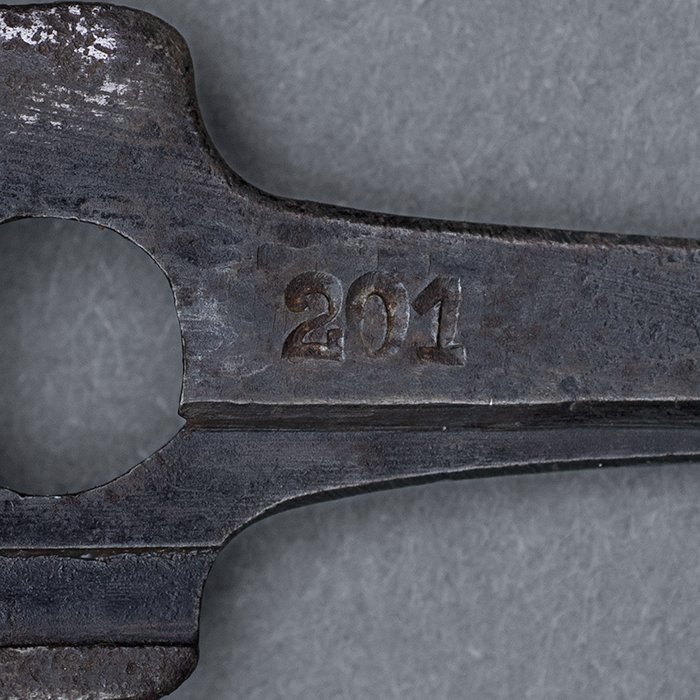 Polizei proofed P.08 take down tool, blued forged steel embossed 201, stamping on opposite side appears to read 3XX0, shows wear to finish and areas of minor pitting, USD $100