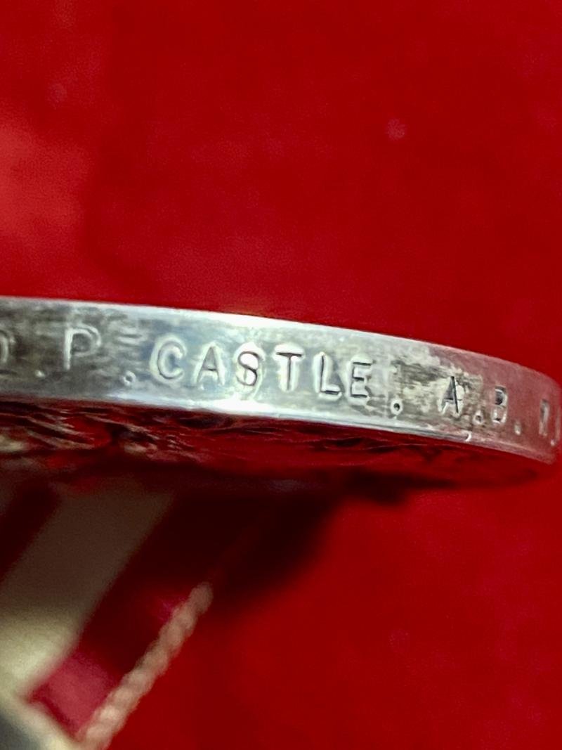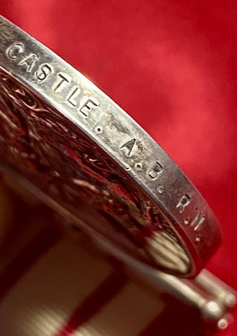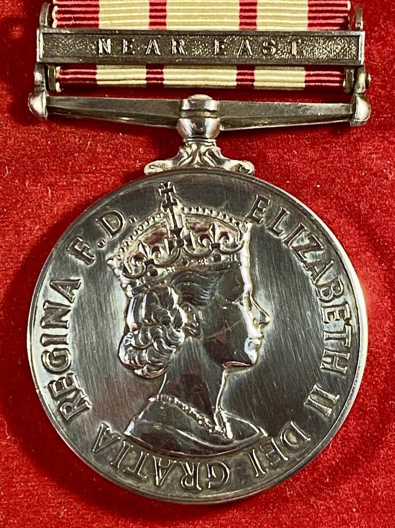 Here on offer is a fine example of a ERII Naval General Service Medal 1915-62 with a NEAR EAST clasp issued for Operation Musketeer, Suez Crisis 1956It is named to D.P. CASTLE who served in the Royal Navy as an able seaman.Awarded for service in support of 'Operation Musketeer', a conflict often referred to as the 'Suez Crisis' that took place between 31st October to 22nd December 1956.The circular medal and swivel mount are made of sterling silver, as is the clasp that surmount it.HistoryThe Naval General Service Medal 1915-62 was a British Empire campaign medal presented to those who participated in naval operations for which no other separate medal was intended. The medal was instituted in 1915 and was the naval equivalent to the General Service Medal 1918-1962.As is the case with other general service medals, the Naval General Service Medal 1915-62 was always issued with a clasp denoting the area of operations. Subsequent service is recognised by the award of further clasps to be worn on the original medal.DescriptionThe medal is circular, 36mm in diameter and struck in silver. The obverse of this medal bears the image of the Tudor Crowned bust of Elizabeth II, surrounded by the words:ELIZABETH II DEI GRATIA REGINA F.D.The reverse depicts an image of 'Britannia' in a chariot pulled by two sea-horses.The edge is officially impressed in plain block capitals with:D/JX. 923503 D.P. CASTLE A.B. R.N.The D/JX relates to a seaman from the Devonport Port Division who signed up for long service (12 years plus optional 10 years to qualify for pension).A.B. R.N. relates to the role of Able Seaman in the Royal Navy.It is suspended on its original section of red and white striped ribbon, that is stitched together and has a pin clasp stitched on the reverse at the top.It is fitted with an original silver clasp for:NEAR EAST.The medal itself in in excellent condition with a clean polished finish with some light surface scratches.The medal measures 1.4' (3.6cm) diameter and weighs 44g with the clasp and ribbon.Please see my pictures for the details of the condition, which complement this description.Please see my TERMS OF BUSINESS regarding Deliver Charges and Insurance regarding additional insurance cover, should you require it, BEFORE the item is dispatched.The responsibility lies with the customer to check with your Customs restrictions that this item can be imported into your country.Thanks for taking the time to look.