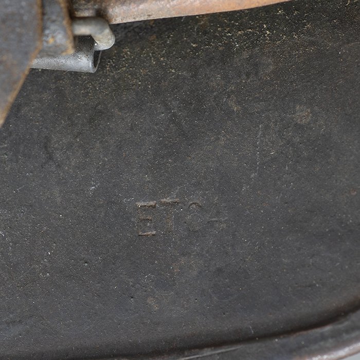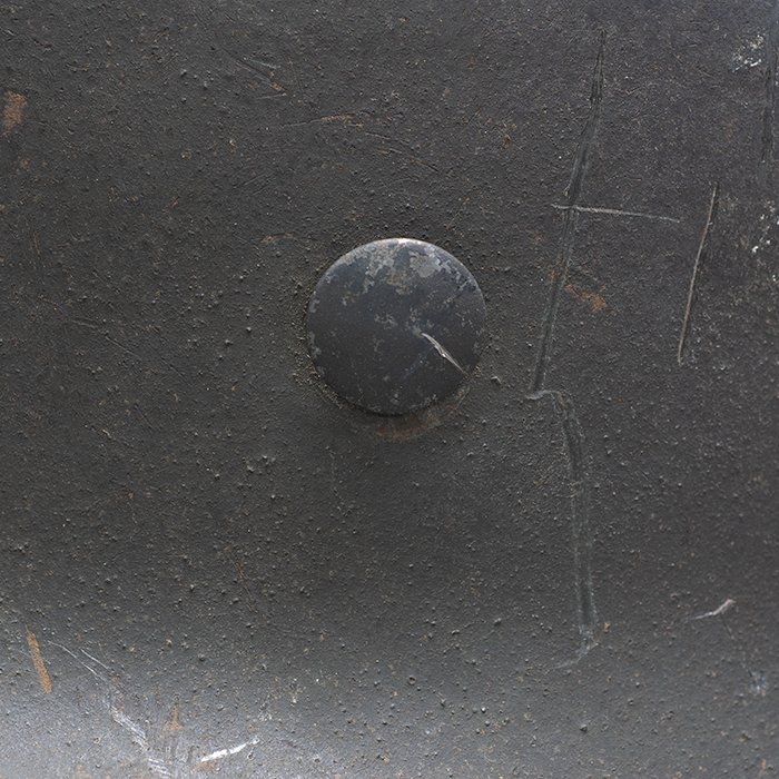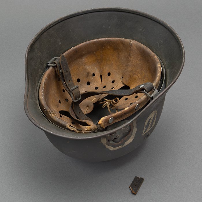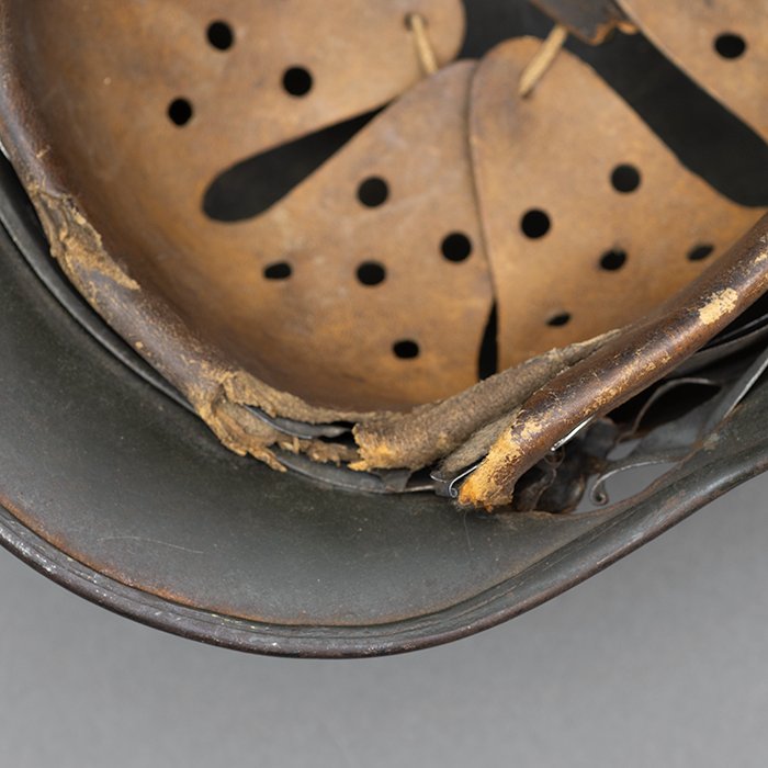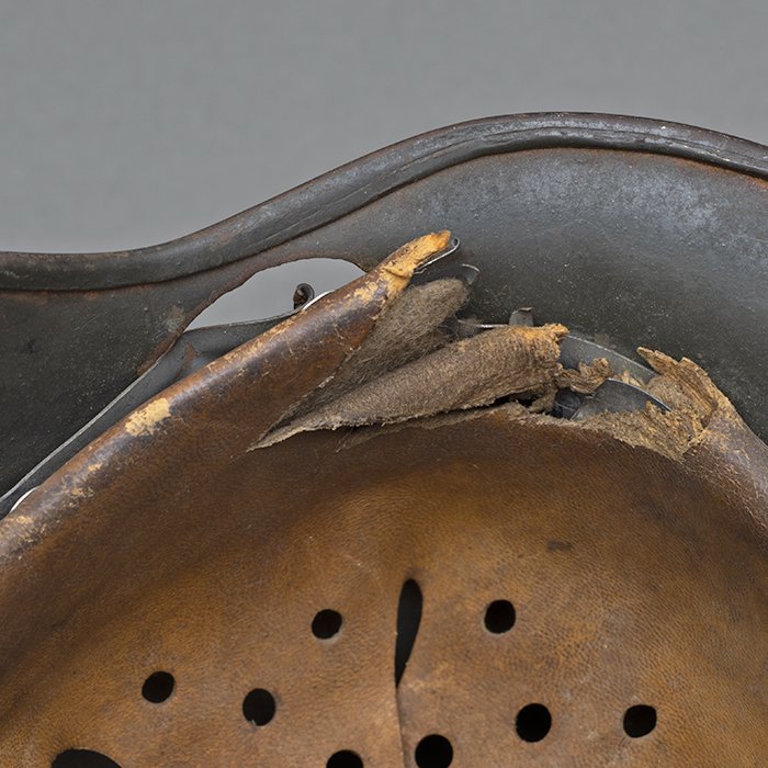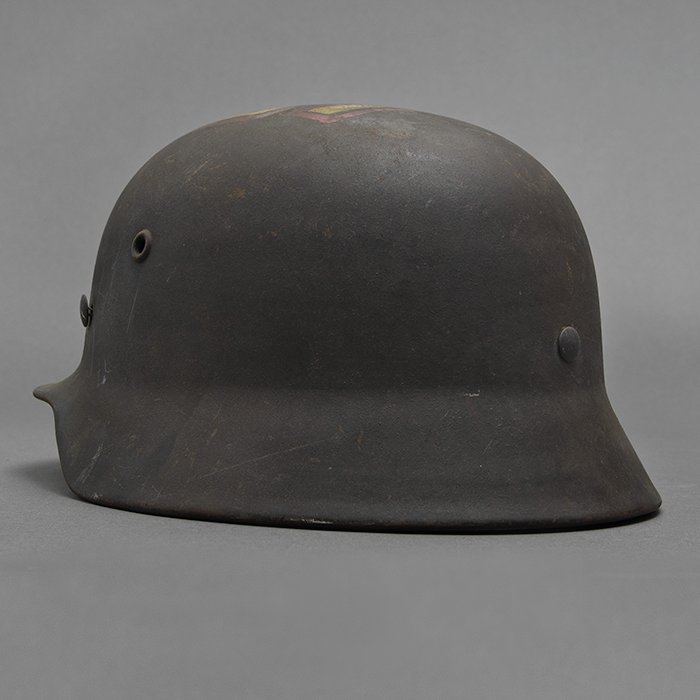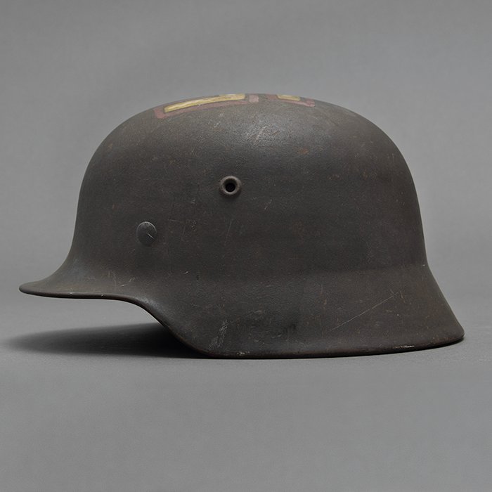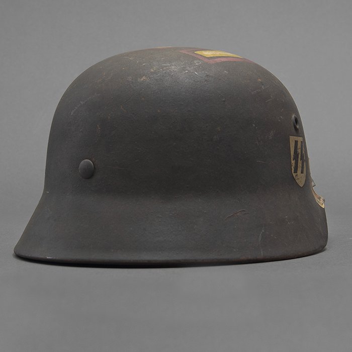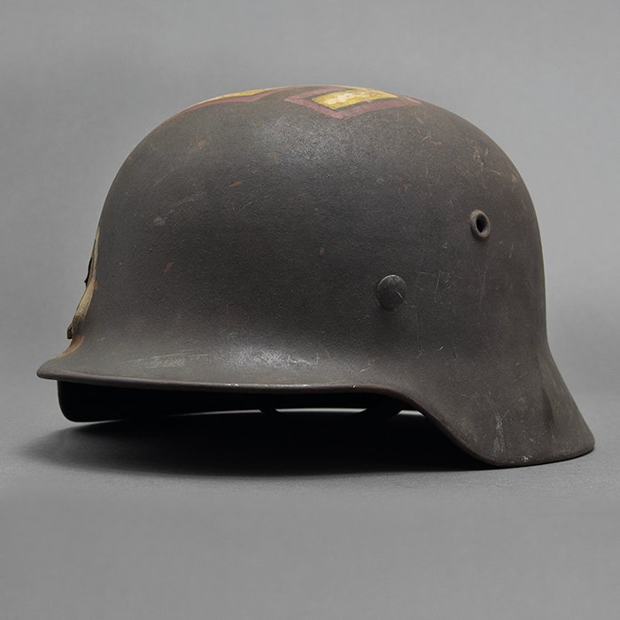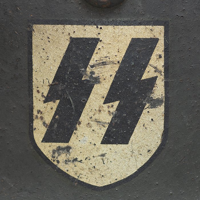 Full profileSpectacular battle damaged Waffen-SS M40 single decal 'GI Art' helmet, the helmet was souvenired by a Michigan USA based GI who participated in the Ardennes battles, please paste the URL below for additional details about its history, the shell is stamped ET64, the lot number is 932 which, as stated in the thread, indicates production in mid to late 1940, battle damage aside, the liner band has not been disturbed and the two remaining split pins still have their washers, the lightly worn brown colored leather liner is stamped size 56, the drawstring is still in place, the chinstrap is complete but separated, with one small piece being loose, the end has the appearance of never having been unbuckled, the matte schiefergrau finish is largely intact except where damaged and painted over, the helmet's classic ET decal has minor non detracting wear, there are a few vertical scratches to the helmet's opposite side, the (likely) shrapnel damage knocked out a section of the shell including the right liner pin, sections of the liner band and leather liner were mangled, the helmet's top has a large hand swastika hand painted in yellow with white highlights and red border, the shrapnel hole was outlined in white paint, as mentioned in the discussion, the helmet lacks patina from repeated handling and is still quite dusty internally, one-of-a-kind battle souvenir, USD $6000 HOLDhttps://www.wehrmacht-awards.com/forums/forum/wehrmacht-uniforms-and-equipment/john-burnett-helmet-forum/15008656-ss-battle-damaged-g-i-art-m40-helmet