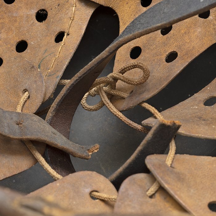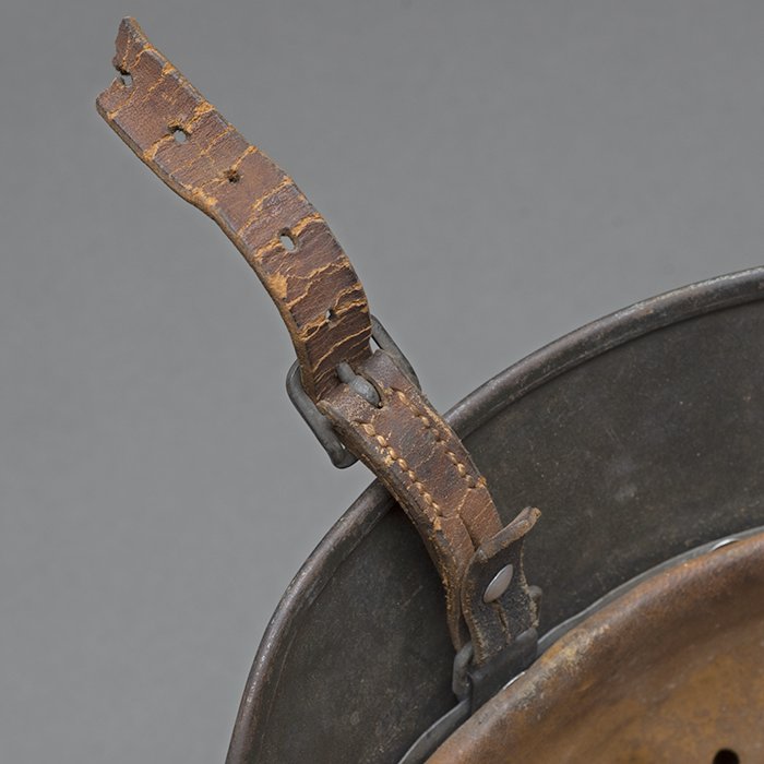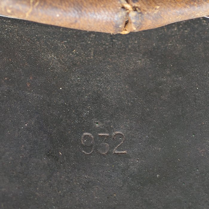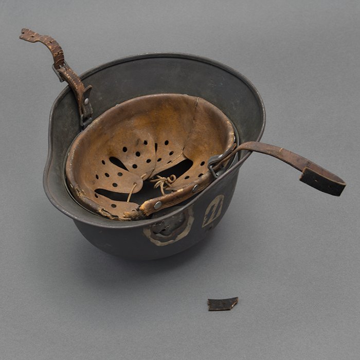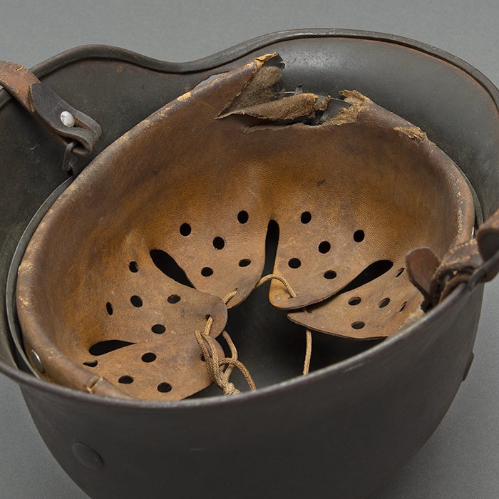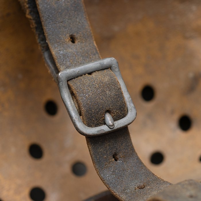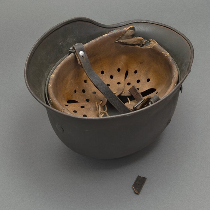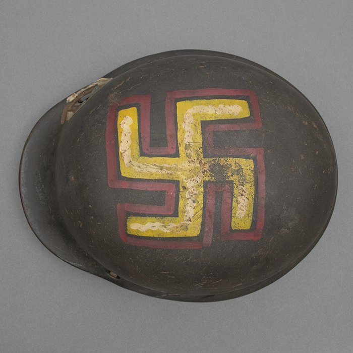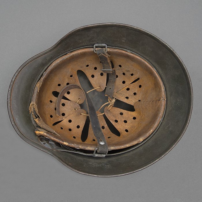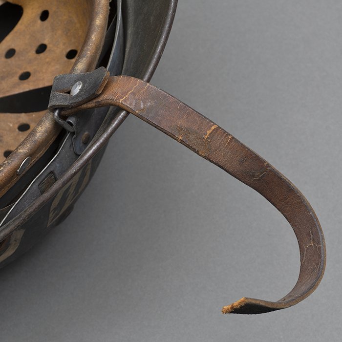 Full profileSpectacular battle damaged Waffen-SS M40 single decal 'GI Art' helmet, the helmet was souvenired by a Michigan USA based GI who participated in the Ardennes battles, please paste the URL below for additional details about its history, the shell is stamped ET64, the lot number is 932 which, as stated in the thread, indicates production in mid to late 1940, battle damage aside, the liner band has not been disturbed and the two remaining split pins still have their washers, the lightly worn brown colored leather liner is stamped size 56, the drawstring is still in place, the chinstrap is complete but separated, with one small piece being loose, the end has the appearance of never having been unbuckled, the matte schiefergrau finish is largely intact except where damaged and painted over, the helmet's classic ET decal has minor non detracting wear, there are a few vertical scratches to the helmet's opposite side, the (likely) shrapnel damage knocked out a section of the shell including the right liner pin, sections of the liner band and leather liner were mangled, the helmet's top has a large hand swastika hand painted in yellow with white highlights and red border, the shrapnel hole was outlined in white paint, as mentioned in the discussion, the helmet lacks patina from repeated handling and is still quite dusty internally, one-of-a-kind battle souvenir, USD $6000 HOLDhttps://www.wehrmacht-awards.com/forums/forum/wehrmacht-uniforms-and-equipment/john-burnett-helmet-forum/15008656-ss-battle-damaged-g-i-art-m40-helmet