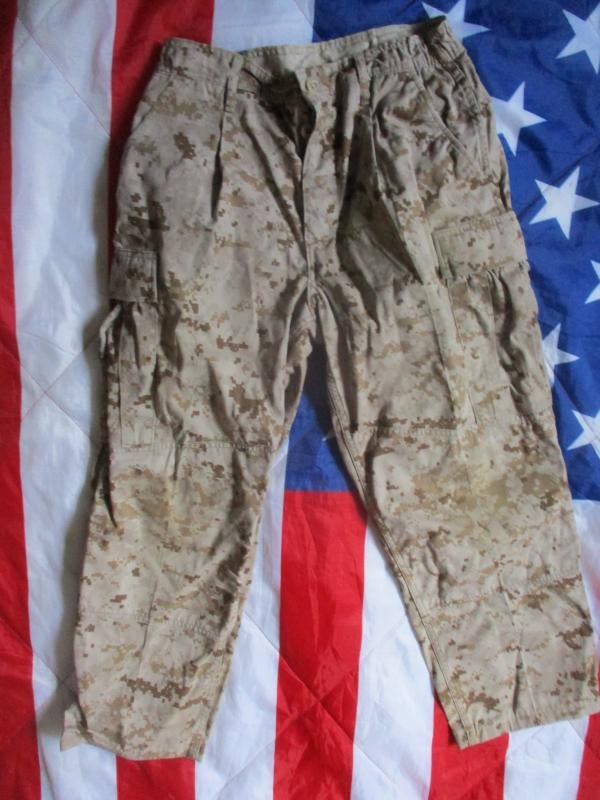 GENUINE USMC issue MCCUU COMBAT PANTS WITH ISSUE LABELS INSIDE CLASSIC us marines usmc uniform pants .MADE IN AMERICA by american appareal in 2006 = CONTRACT SPO100-06-D-0331THESE ARE THE STANDARD M65 TYPE COMBAT TWILL MATERIAL ,VERY STRONG , COMFY TO Wear .COLOUR = US MARINES DESERT DIGITAL CAMO ! WITH USMC CAP BADGE EGA IN THE CAMO PRINTFEATURES = 2 HAND POCKETS , 2 BACK POCKETS , 2 LARGE BELLOW CARGO LEG POCKETS , DOUBLE THICK KNEE AREA , BELT LOOPS , PART ELASTIC WAIST FOR PERFECT FIT , BELT LOOPS , BUTTON WAIST AND FLY .CONDITION = LOOK good been WORN USED , small dirt mark on front left leg by cargo pocket , LEGS MADE SHORTER TO A MEDIUM SHORT SIZE NOW .i can not see or find any holes rips etc a real good pair .the pictures show condition SIZE = MEDIUM / REGULAR now made into SHORT ...TO IT 28' TO 33 1/2' WAIST ( ADJUSTABLE WITH SIDE elastic FOR PERFECT FIT ) / 28 1/2' INSIDE LEG ( MEASURES 14 1/2' OR 37 CM ACROSS WAIST BAND UN STRETCHED AND STRETCHED WILL GO UP TO 16 3/4 or 43cm INCHES WHEN LAID FLAT SO WILL GO UP T0 A 33 INCH WAIST / now measure your own pants or self before buying so no size problems AS THERE WILL BE NO RETURNS ON SIZE ISSUES THEY ARE MESURED AND SIZE IS CLEAR TO SEE SO BE SURE BEFORE BUYING THEM