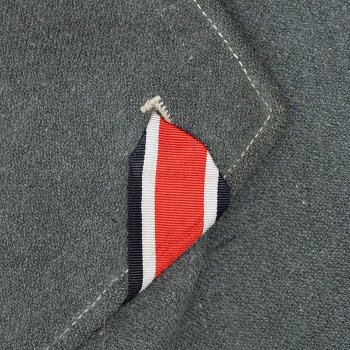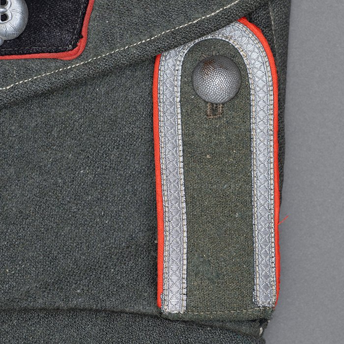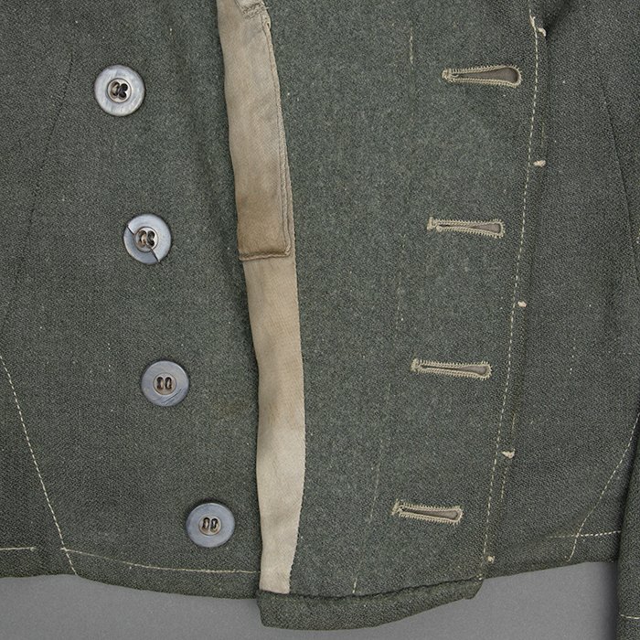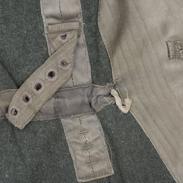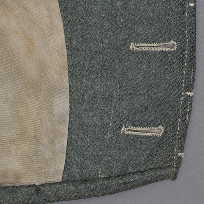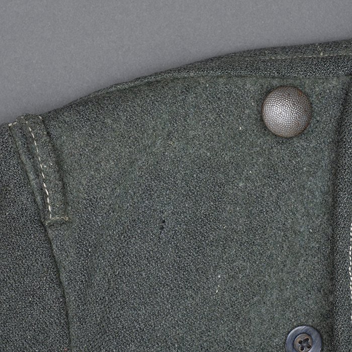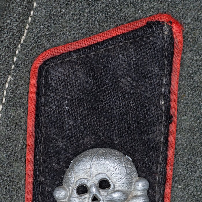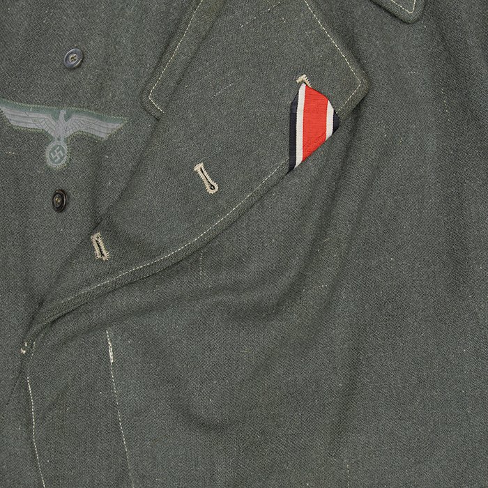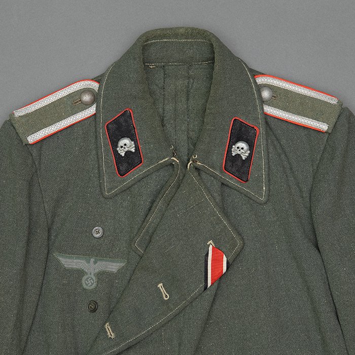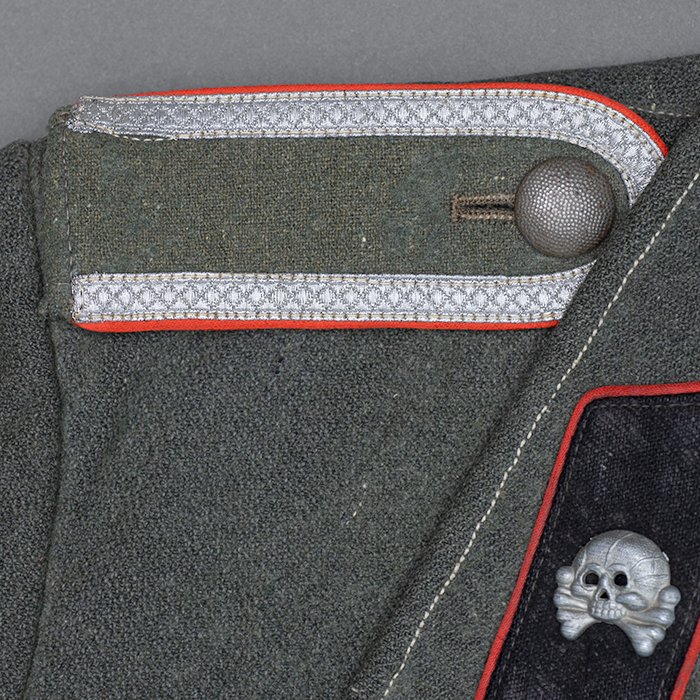 Service used Heer assault gun wrap for a Heer Sturmartillerie Unteroffizier, constructed of mid war quality field grey wool and having lining components, internal pockets, tie tape tunnels and buttoning tabs of light grey colored rayon, the belt hook support straps are of webbing, the tie tapes are made of white cotton and the left position is still tied, in bright light the faint size block may be perceived with the F43 depot marking readable, lining is faded and yellowed from much wear, the right internal lower pocket seam is partially undone and there is a hole to the pocket's upper portion, the large front closure buttons are horn and originally sewn, one of them is cracked, the smaller lapel and cuff buttons are also of horn, each cuff has one button of civilian origin, the collar patches' bodies are made of black wool, each has hochrot colored rayon piping, the Totenkopfen are silvered zinc of the type with three triangular edge prongs each, the collar patches are machine applied, the matched pair of slip on shoulder straps are constructed of a slightly earlier vintage wool, these also have rayon piping, their metallic NCO Tresse is machine applied, the straps are anchored by field grey painted pebbled steel buttons and these too are originally sewn, the appropriate subdued woven national emblem is a zig zag machine applied replacement and this is a good match and is well done, an EKII ribbon is attached to the top lapel buttonhole and this appears to be a postwar addition, the wrap's exposed surfaces show greater nap wear but there are no holes or repairs to the body, the threads used in construction have lost much of their original coloring, appealing example as would have been worn by the crews of self-propelled artillery like the Hummel, USD $4500
