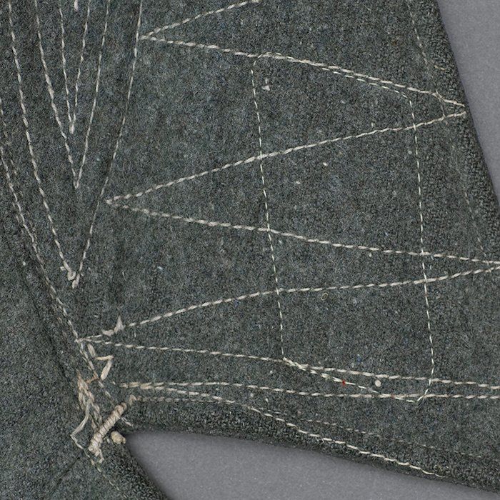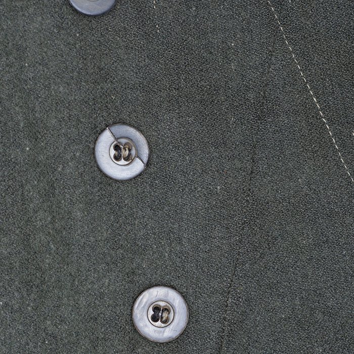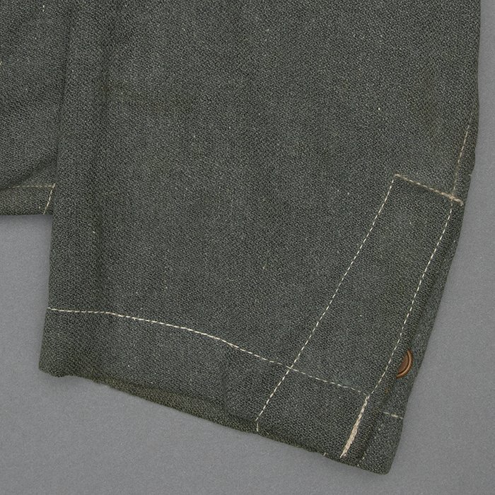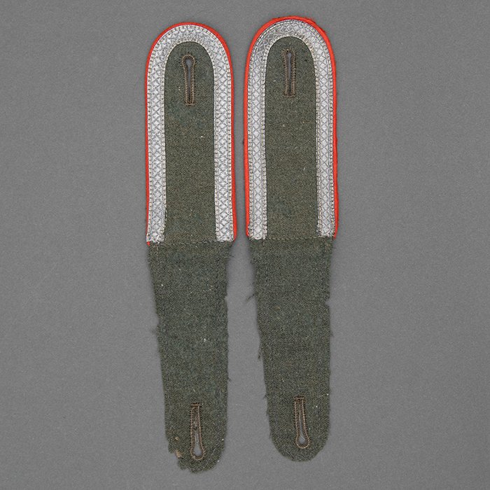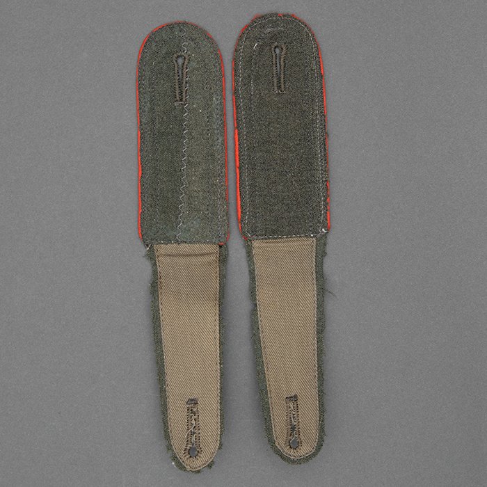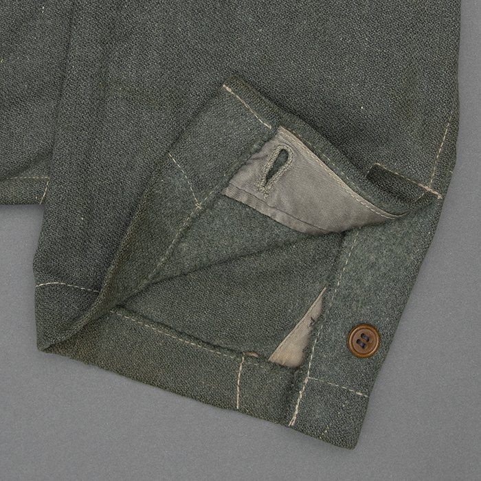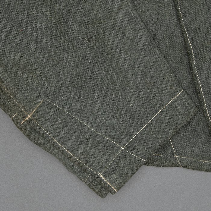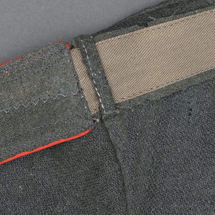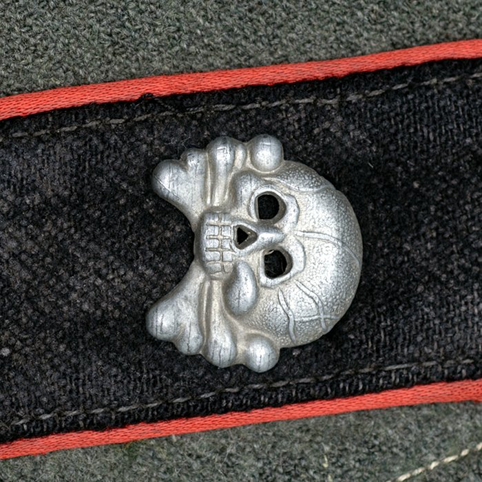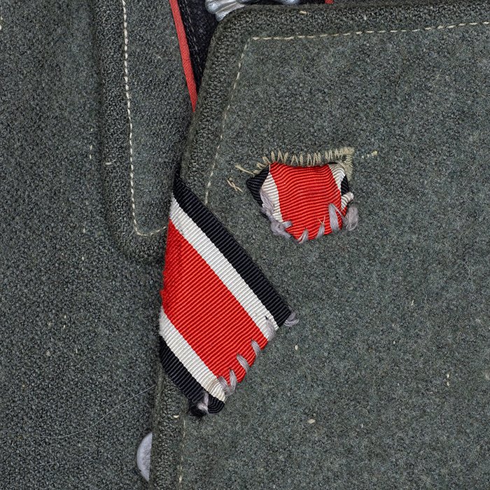 Service used Heer assault gun wrap for a Heer Sturmartillerie Unteroffizier, constructed of mid war quality field grey wool and having lining components, internal pockets, tie tape tunnels and buttoning tabs of light grey colored rayon, the belt hook support straps are of webbing, the tie tapes are made of white cotton and the left position is still tied, in bright light the faint size block may be perceived with the F43 depot marking readable, lining is faded and yellowed from much wear, the right internal lower pocket seam is partially undone and there is a hole to the pocket's upper portion, the large front closure buttons are horn and originally sewn, one of them is cracked, the smaller lapel and cuff buttons are also of horn, each cuff has one button of civilian origin, the collar patches' bodies are made of black wool, each has hochrot colored rayon piping, the Totenkopfen are silvered zinc of the type with three triangular edge prongs each, the collar patches are machine applied, the matched pair of slip on shoulder straps are constructed of a slightly earlier vintage wool, these also have rayon piping, their metallic NCO Tresse is machine applied, the straps are anchored by field grey painted pebbled steel buttons and these too are originally sewn, the appropriate subdued woven national emblem is a zig zag machine applied replacement and this is a good match and is well done, an EKII ribbon is attached to the top lapel buttonhole and this appears to be a postwar addition, the wrap's exposed surfaces show greater nap wear but there are no holes or repairs to the body, the threads used in construction have lost much of their original coloring, appealing example as would have been worn by the crews of self-propelled artillery like the Hummel, USD $4500