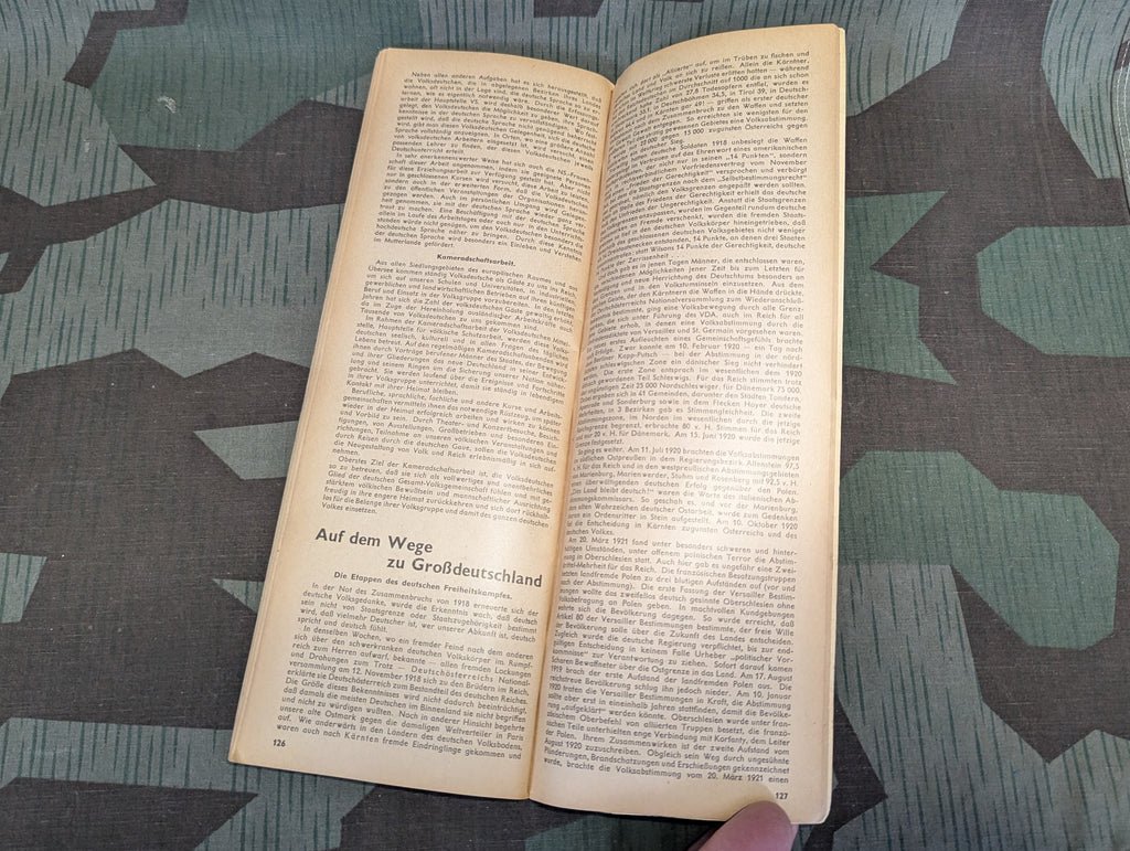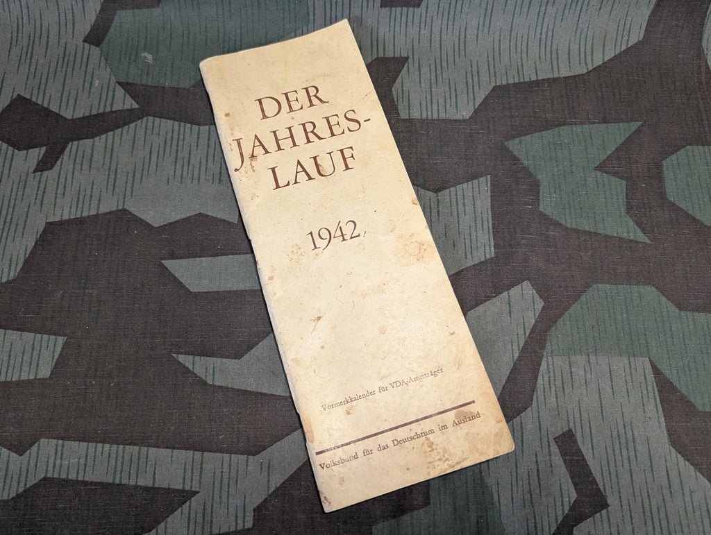 Der Jahreslauf 1942 calendar for VDA(Verein fΓΌr Deutsche Kulturbeziehungen im Ausland - 'Association for German cultural relations abroad')officials.It is in fairly good condition and it does have quite a few entries, also quite a few blank pages. It also appears to have been used for many years after the war for notes with dates going out into the 1950's.During the 1930s and 1940s, the VDA distributed over 1,200 different donation badges, postcards, and other items to raise funds for its charity work. This was done alongside other similar charity drives by organizations such as the Winterhilfswerk (WHW), the Deutsches Rotes Kreuz (DRK/German Red Cross) and others.The VDA was also engaged in spying, using German minorities living in other countries. Its other goals included preservation of German culture among 'racial Germans'. VDA was used to promote Nazi ideals and was especially active in schools. VDA, together with the SS, engaged in preparing and carrying out ethnic cleansing in conquered territories.