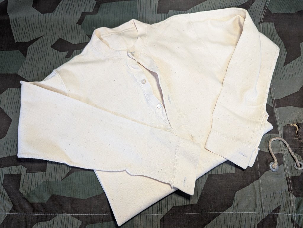 Small stretchy knit German shirt. It is a slightly heavier weight material, more like a winter base layer. Period appropriate, could be early post war manufactured. It is basically new old stock in good condition. The chest measures about 28', but the material is stretchy. It is meant to be a tight fit.