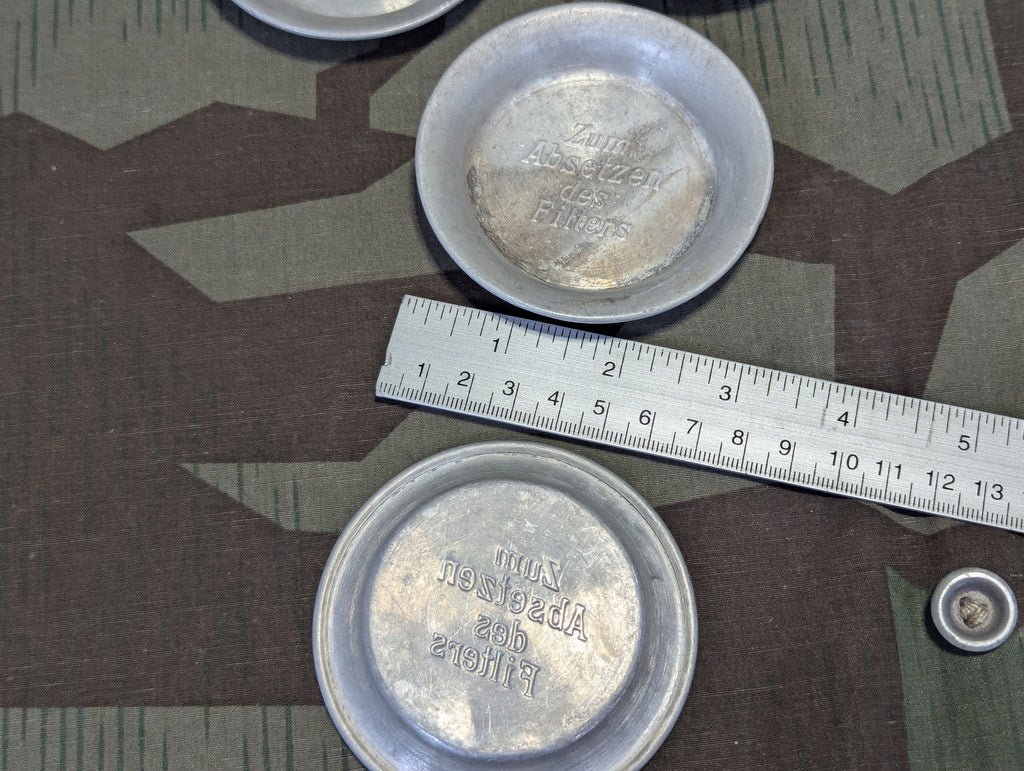 Period aluminumcoaster tray that says Zum Absetzen des Filters ('For setting down the filter'). Price is for one. Used to put coffee filters on (or even used teabags), perhaps something used in a train car or restaurant setting. They have general wear and some discoloration.