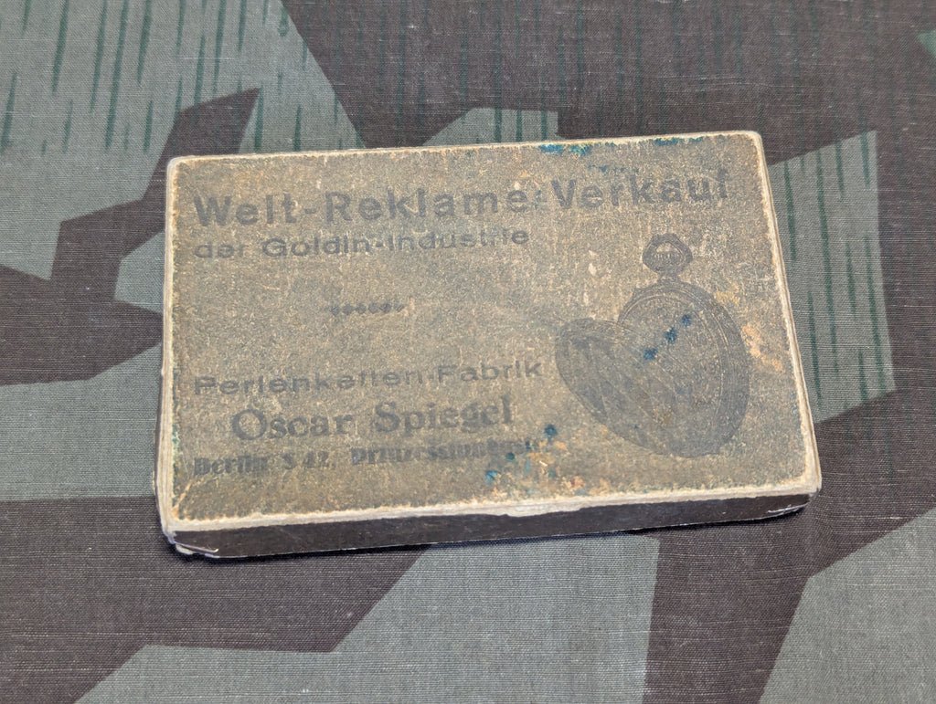 Vintage Oscar Spiegel Welt-Reklame Verkauf gold, pearl and pocket watch cardboard sales box. Somewhat worn with some staining and general aging. It seems like it was likely a gold color and the gold color has oxidized to a dark color with a touch of green.