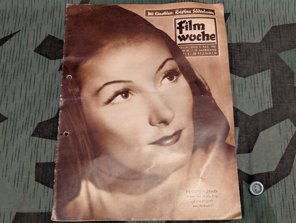 Original Film Woche magazine from Dec 3 1941. There are holes punched in the spine. Decent advertisements and articles on movies. May ship slightly rolled.