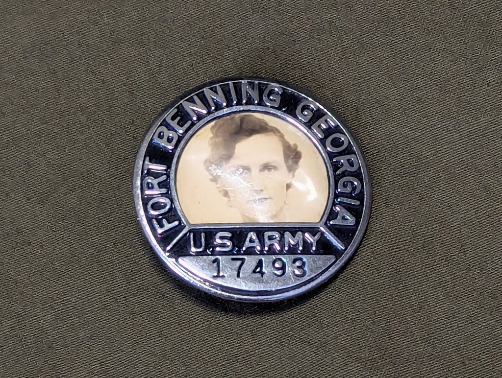 Original WWII US Army women's worker ID badge from Fort Benning, Georgia. The photo is a little wavy, but otherwise very good condition.