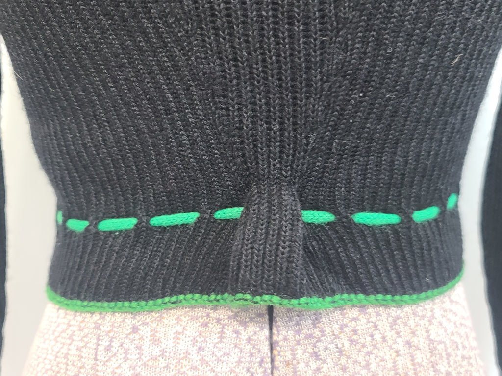 Vintage 1930s / 1940s German traditional knit sweater. Also worn by BDM girls.MEASUREMENTS (approximate):Bust- 29'-32'Waist- 22'-24'Length- 15'Sleeve(shoulder seam to end of cuff) - 19 3/4'Nice black wool knit sweater with green and red trim. Metal buttons. Green ties at the collar and at the waist. The waist is tailored in to give it a flattering look. Super cute sweater that gained popularity in the 1930s and was made for many decades after. It was popular with the BDM (Bund Deutscher MΓ€del - League of German Girls) as well and was an approved garment for certain regions.Good condition. There are just a few pulls in the material and on seams. The top button is a little loose and could be sewn in better.