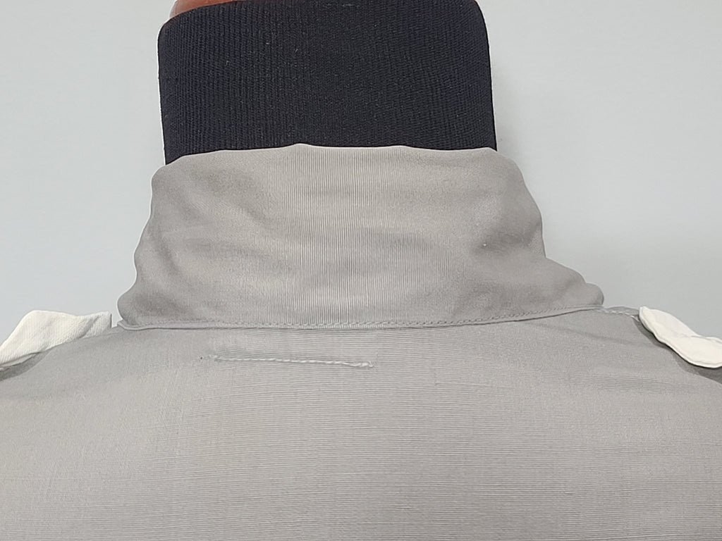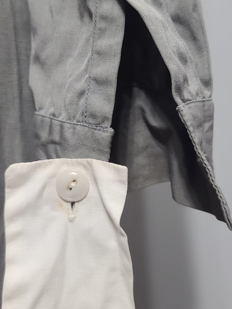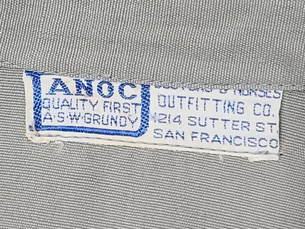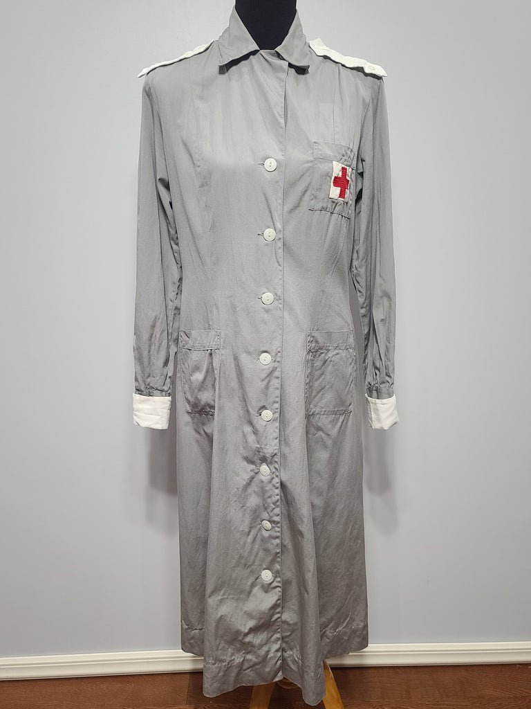 Original WWII American Red Cross 'gray lady' uniform dress. This is the indoor uniform of the Hospital and Recreation Corps.MEASUREMENTS (approximate):Bust- 39'Waist- 34'Hips- 40'Length- 45 1/4'Sleeve(shoulder seam to end of cuff) - 24'Made of cotton. The shoulder epaulets and cuffs button in and are removeable. Missing the belt. Overall fairly good condition - it does need a cleaning (I didn't have time to launder it, so selling it as-is - it wouldn't take much to freshen it up). Overall discoloration / age. There is some light staining under the arms. Small brown stain on the chest and another by the buttons on the skirt. The white cuffs have some light staining as well.