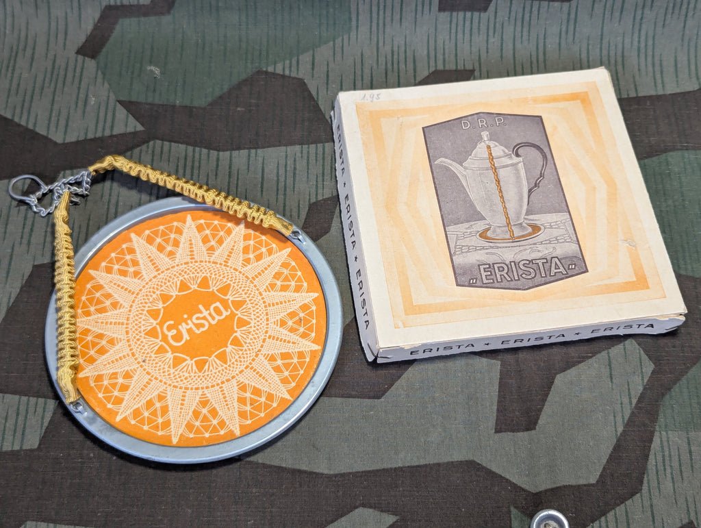 This is an interesting coaster for teapots, wine bottles, and anything else that might drip on your counter. It is a metal tray with a felt pad and a cloth covered chain strap to firmly hold the coaster on. Erista brand. Marked D.R.P. (Deutsches Reichspatent) Made in Germany.This one is in like new condition with its original box. The box shows some wear and is crushed a bit. The coaster itself is basically like new and has a much more elaborate pad than most of the others that I have seen.Wine bottle not included, shown for reference.