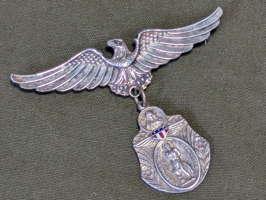 Vintage WWII sweetheart brooch with an eagle holding a charm of St Sebastian - the patron saint of martyrs, athletes and soldiers. US enamel shield with wings, obviously very military in style, but it mentions athletes on the front for whatever reason. Marked Sterling on the back. Some tarnishing and general wear. The loop on the charm is slightly bent. Very unique piece.