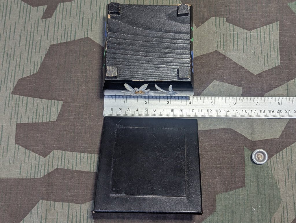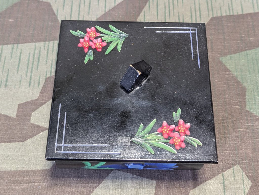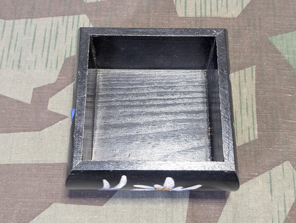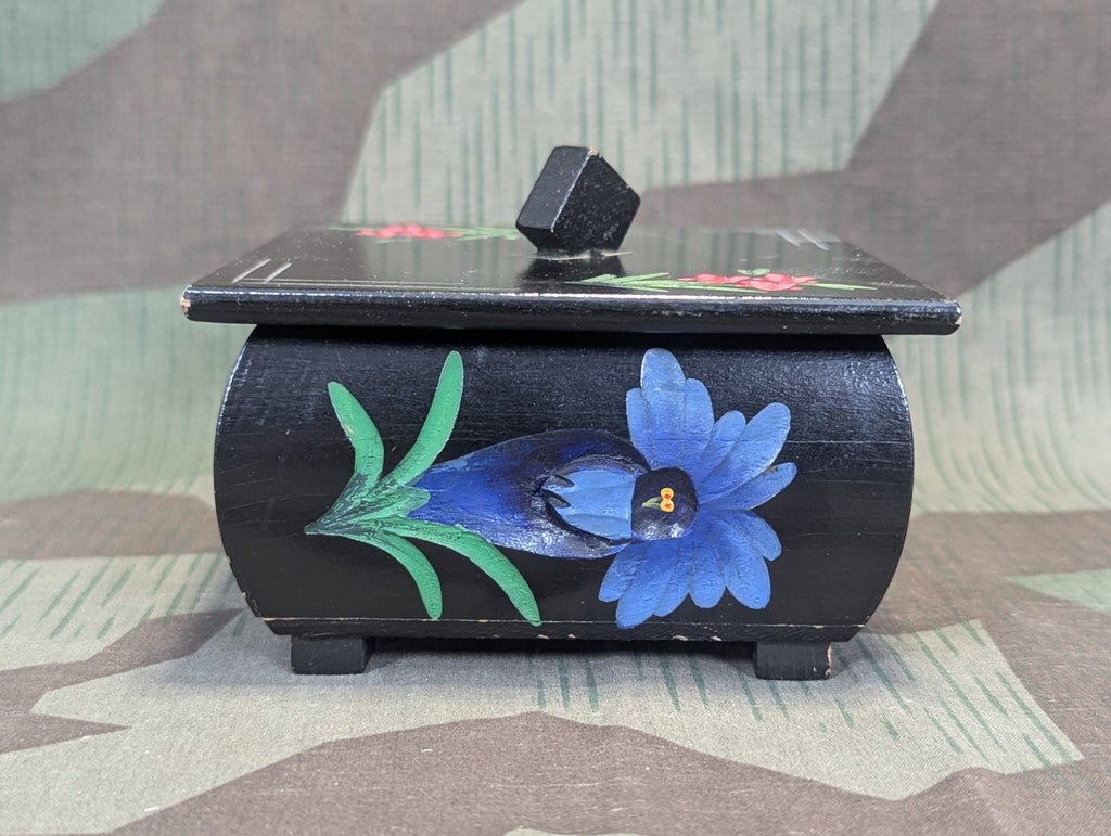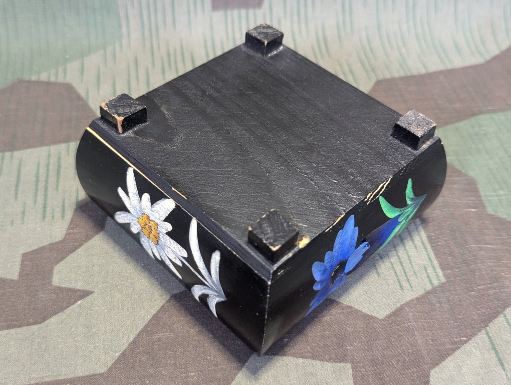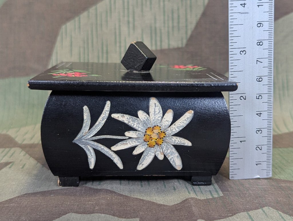 German hand made edelweiss and enzian flower jewelry or keepsake box. The flowers are deeply carved into the box as well as being painted. Some areas of wear long the bottom feet and edges.