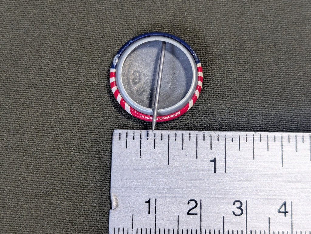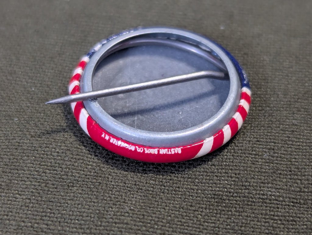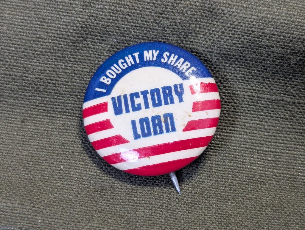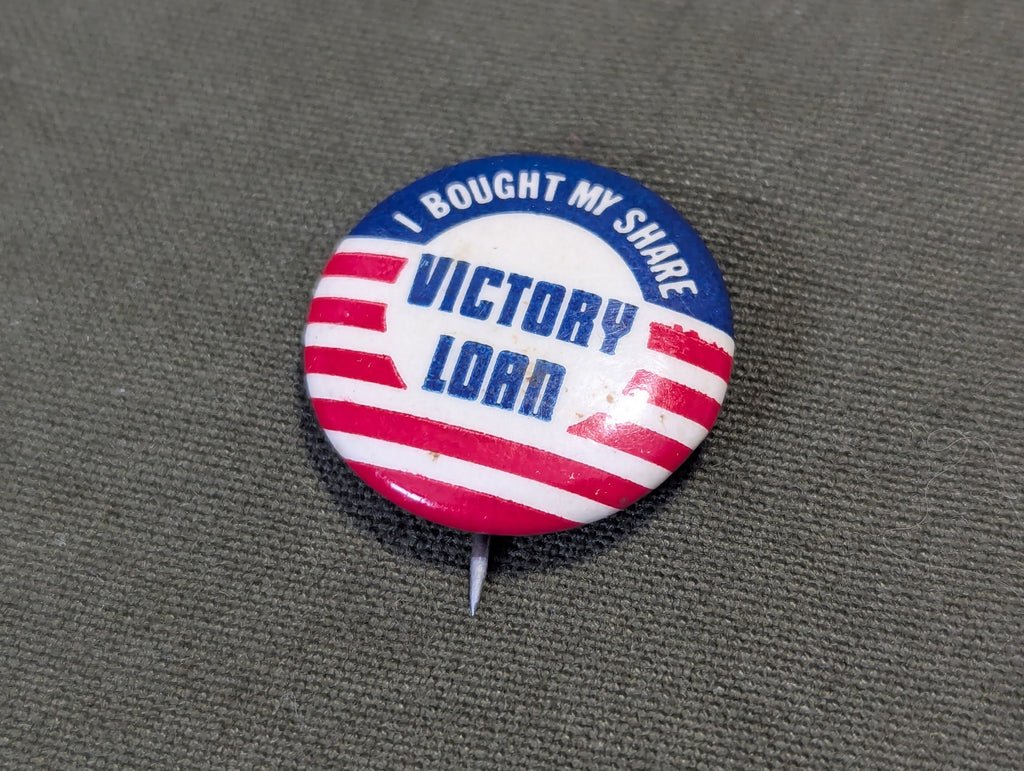 Original 'I bought my share' Victory Loan pinback button. I am unsure if this one is WWI or WWII. Made by Bastian Bros. Some specks on the front, but otherwise fairly good condition.