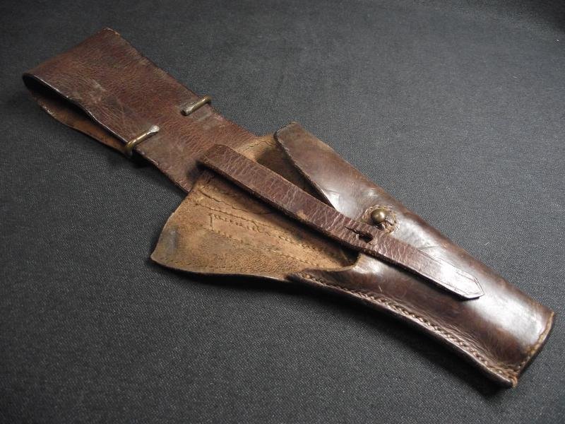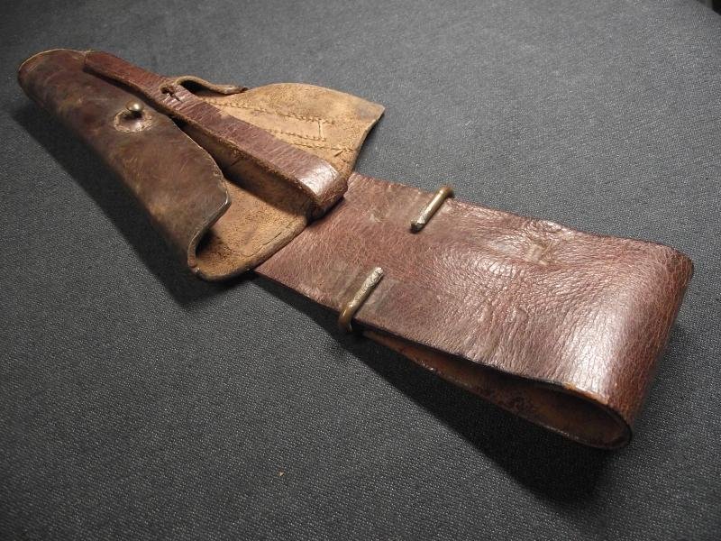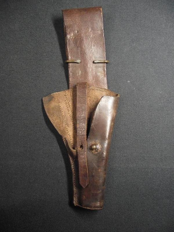 Neat little converted open top holster having its front left side opened up for easy of access to the pistol and a long rear leather belt hanging panel stitched to the holster. Stitching is not new showing age and there is evidence of use and plenty of patina to the cut section of the holster. Such a conversion reminds me of the holsters issued to tank crew during WW2. An oddity but surely interesting conversion.