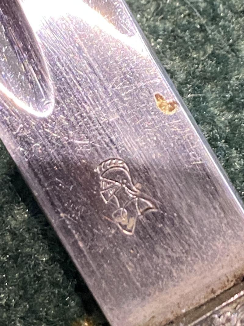 A very decent example of the Third Reich police bayonets used by the Third Reich Police. As most collectors know, there were re-issued Weimar police clamshell bayonet's, with clamshell removed, replacement Police badge and a slightly shorter blade. This is in very collectable condition with black leather scabbard and black leather frog(rare). Stag grips with oval police badge and replacement period rivets. The original Weimar Police issue numbers are stamped into the reverse crossguard and the top of the scabbard fitting. These read 'S.Sch.I. 1125 and S. Sch I. 963. So both come from the same Police area. S.Sch.I.A very nice blade by WKC Weigh knights head on one side and full name on the other.'The sale of Knives and other Edged Weapons are restricted to those aged over 18. Verification of age is required before purchase is concluded.'