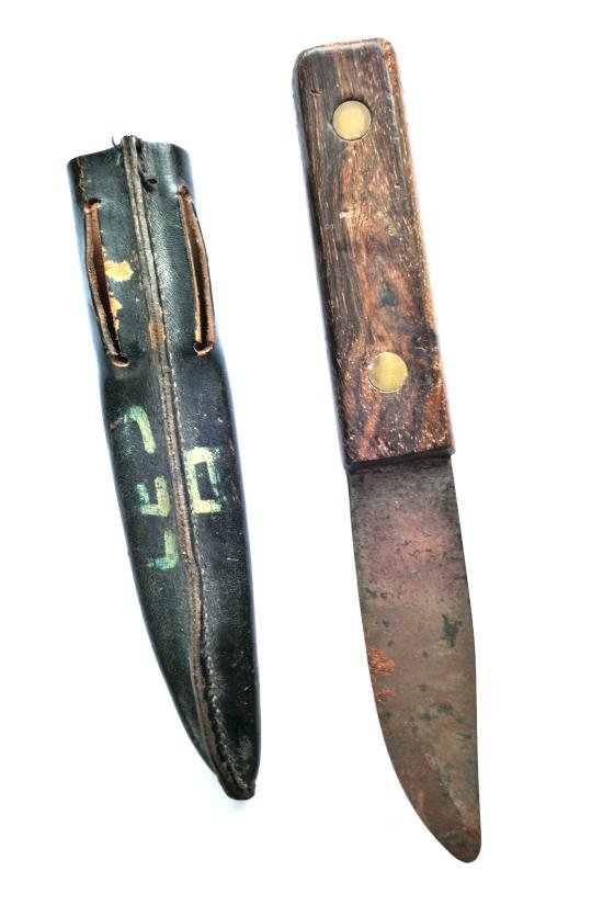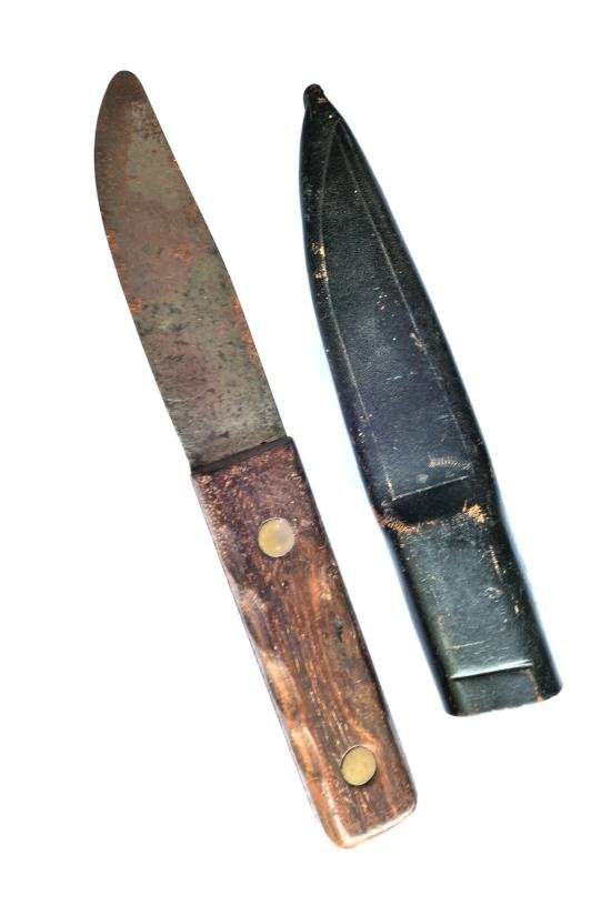 A used RN issue deck and rope knife in sleepy, used condition. The knife is sound but the blade could benefit from light cleaning. The leather scabbard is very good with no dryness or damage.