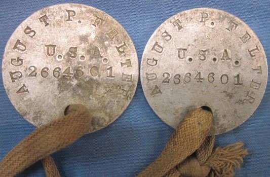 Original period manufacture. Matched pair of tags named to August P. Felter, 2664601, who served with the Machine Gun Company of 317th Infantry Rgt, 80th Division. Somme Offensive 1918, Meuse-Argonne Offensive. Lived at 911 South Canal Street, Pittsburgh Pennsylvania.